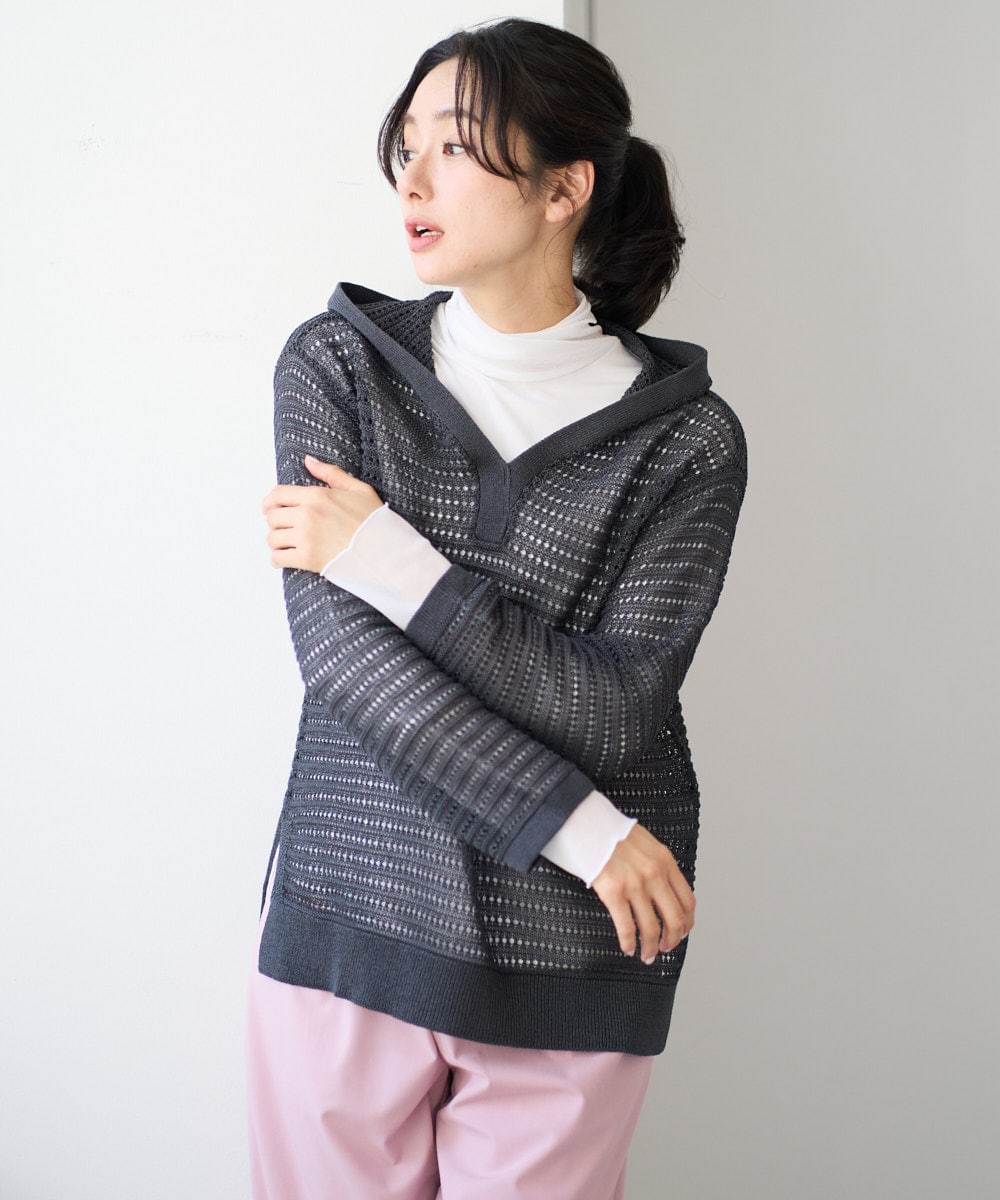 着用感・透かし編みが可愛いニットはフード付きでカジュアルなコーディネートにピッタリ。