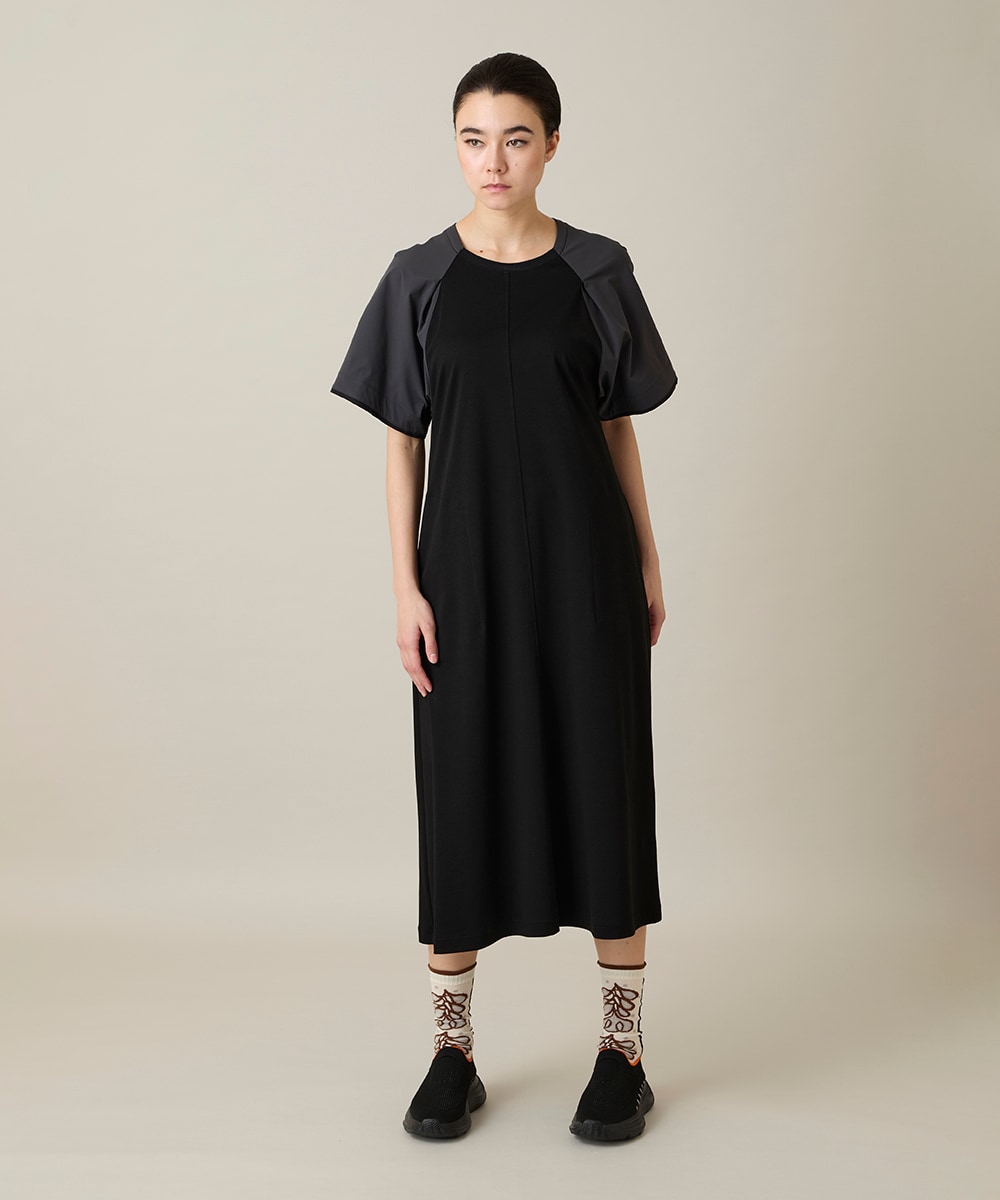 ワンピースは産地限定のソフトさと滑らかな質感にこだわったコットンスムース素材を使用した異素材ジョイントワンピース。シンプルなAラインで体系を選ばず、ラグランの袖部分のフリーモーションタフタがシンプルなシルエットに立体感とモード感を出しており、一枚着でも完成したスタイリングになります。