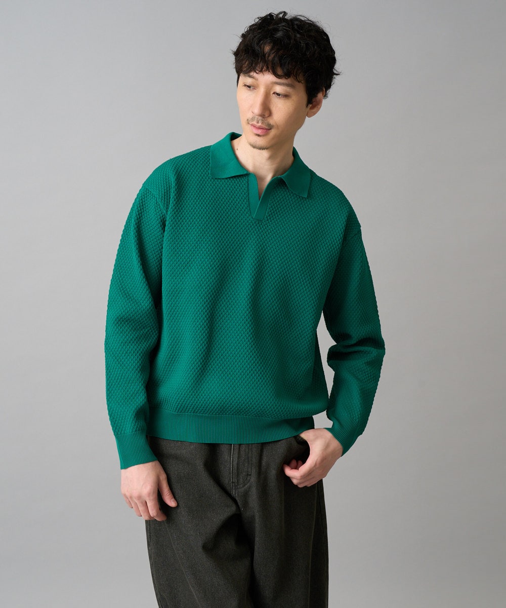 ぽこぽこした立体感が可愛いグリーンのトップスに、