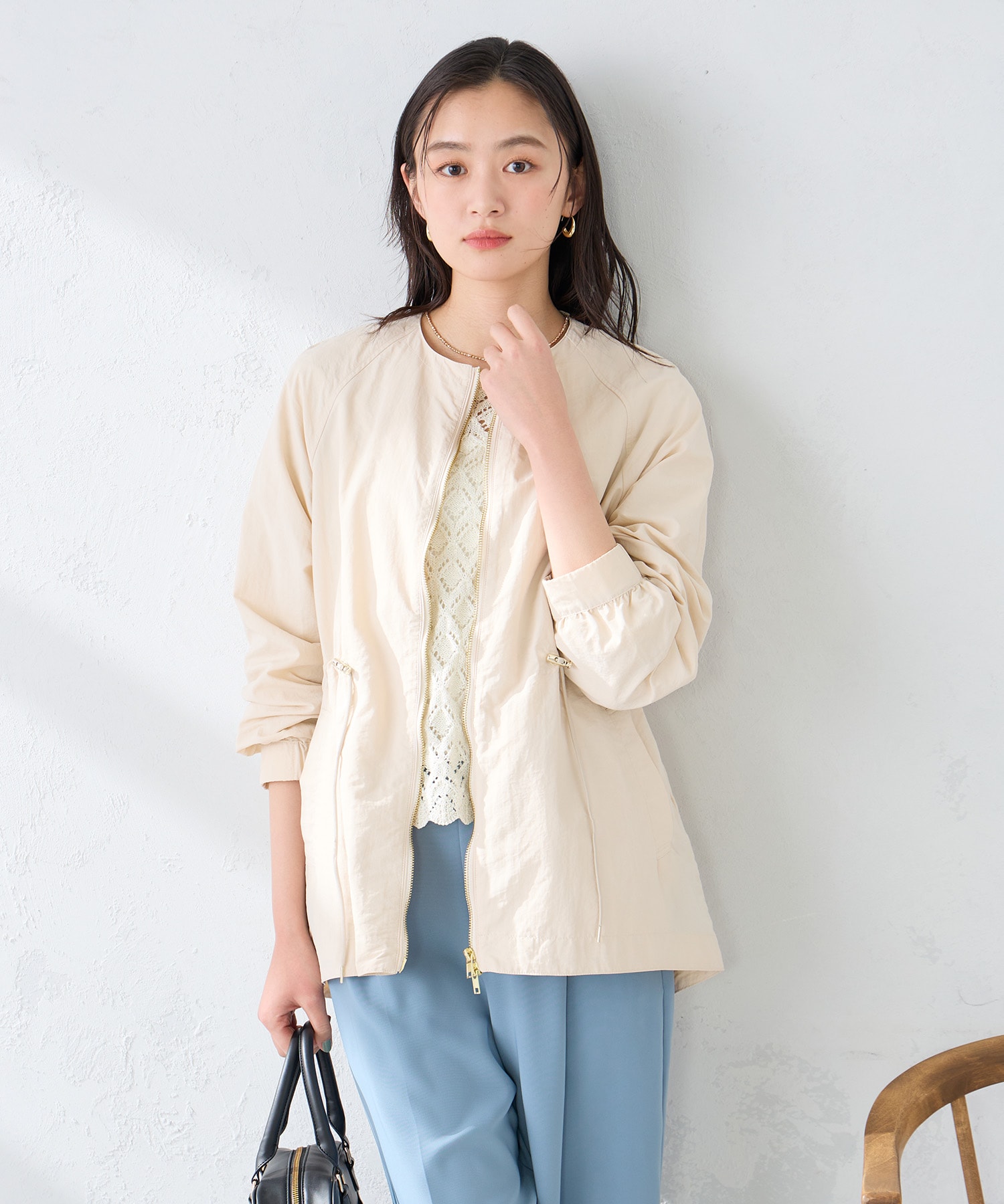 アウターはミドル丈のノーカラーコートです☆