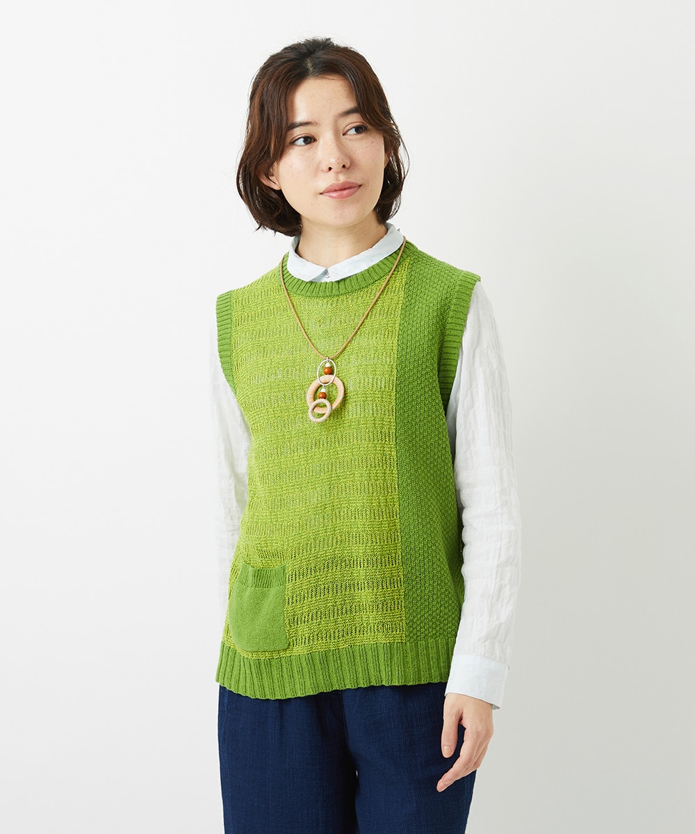 シャリ感のある素材で今から初夏まで着まわせるニットベスト。