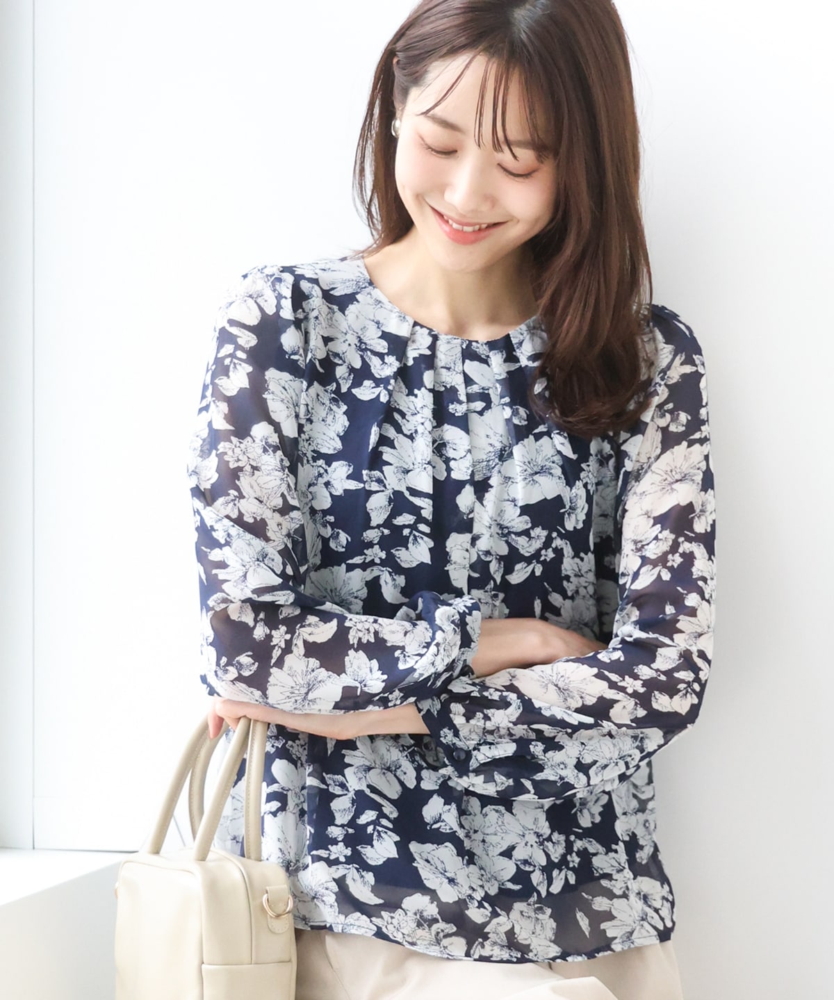 程良い落ち感とふくらみのある素材はきれいめな印象に。