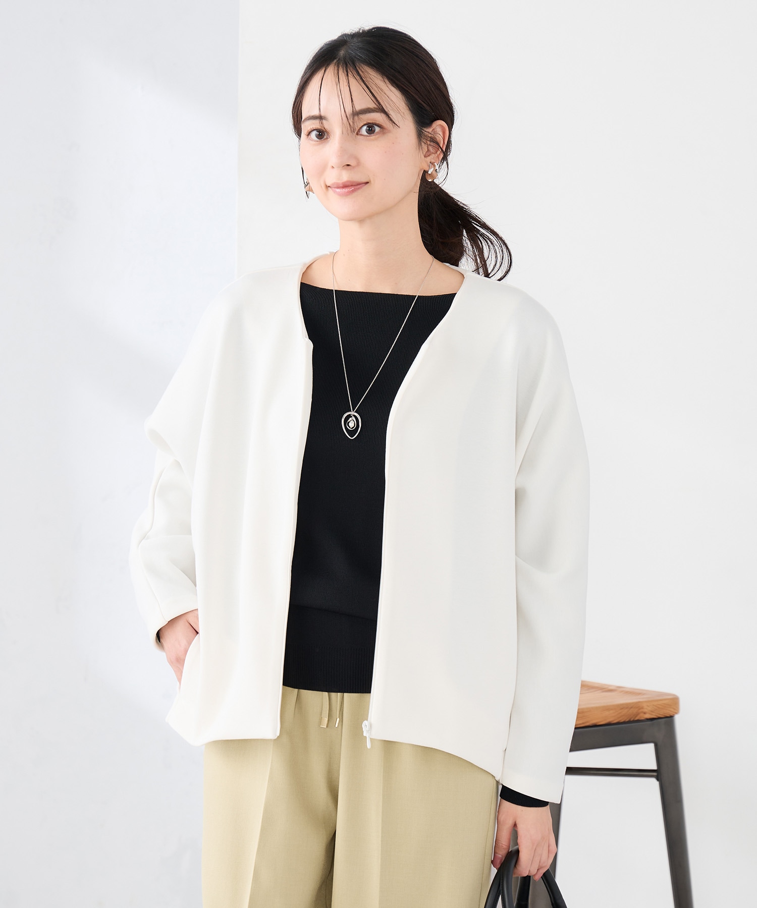 大人かわいいが共存するスタイルは季節の変わり目や時短コーデにも便利なアイテムを白からライトグレーでまとめています