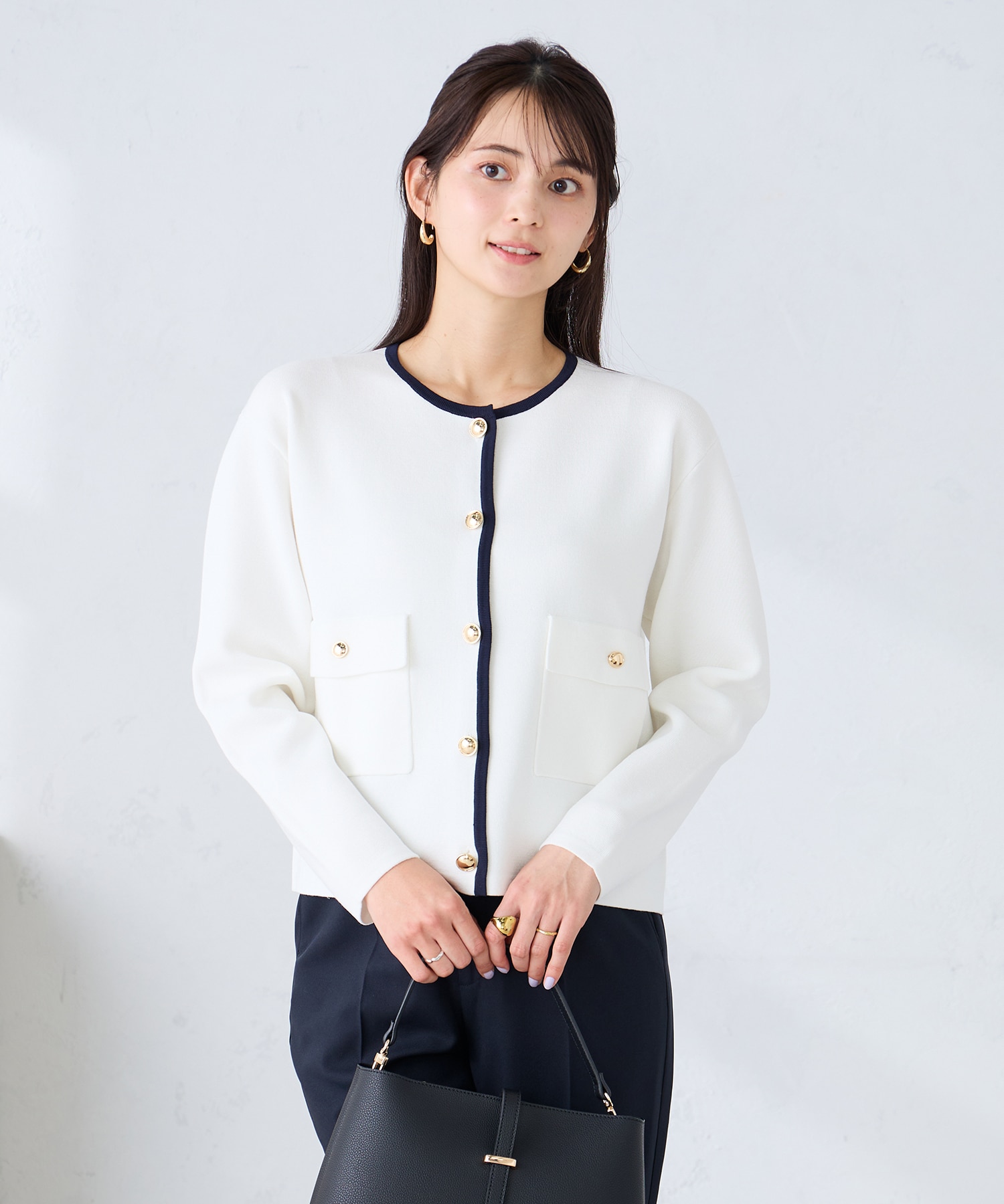 ノーカラージャケットのようなきちんと感がありながらも、ニット素材なので堅苦しくなくサッと羽織れて便利です◎