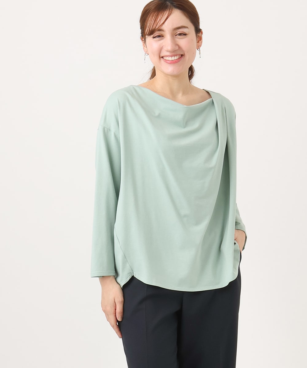 トレンドのドレープデザインが首元に自然な落ち感を生み出し、顔周りを明るく華やかに見せながら、上品さと女性らしさを引き立てます。