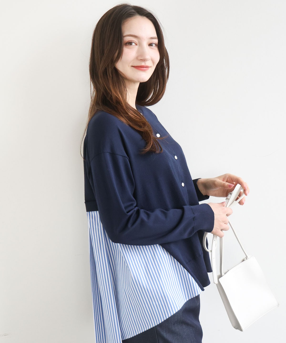 後ろ身頃をストライプ生地で切り替えたデザインニット。