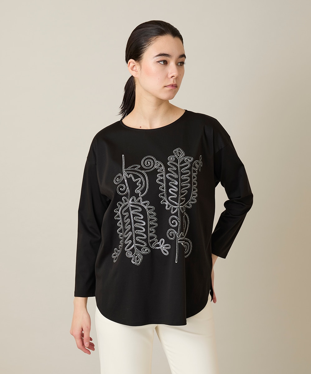 ボタニカルモチーフのロングTシャツは線画風のアート柄がポイントで、上品さと個性を兼ね備えています。滑らかなコットンはスパンコール刺繍が上品に輝き、着るだけで華やかさを演出。
