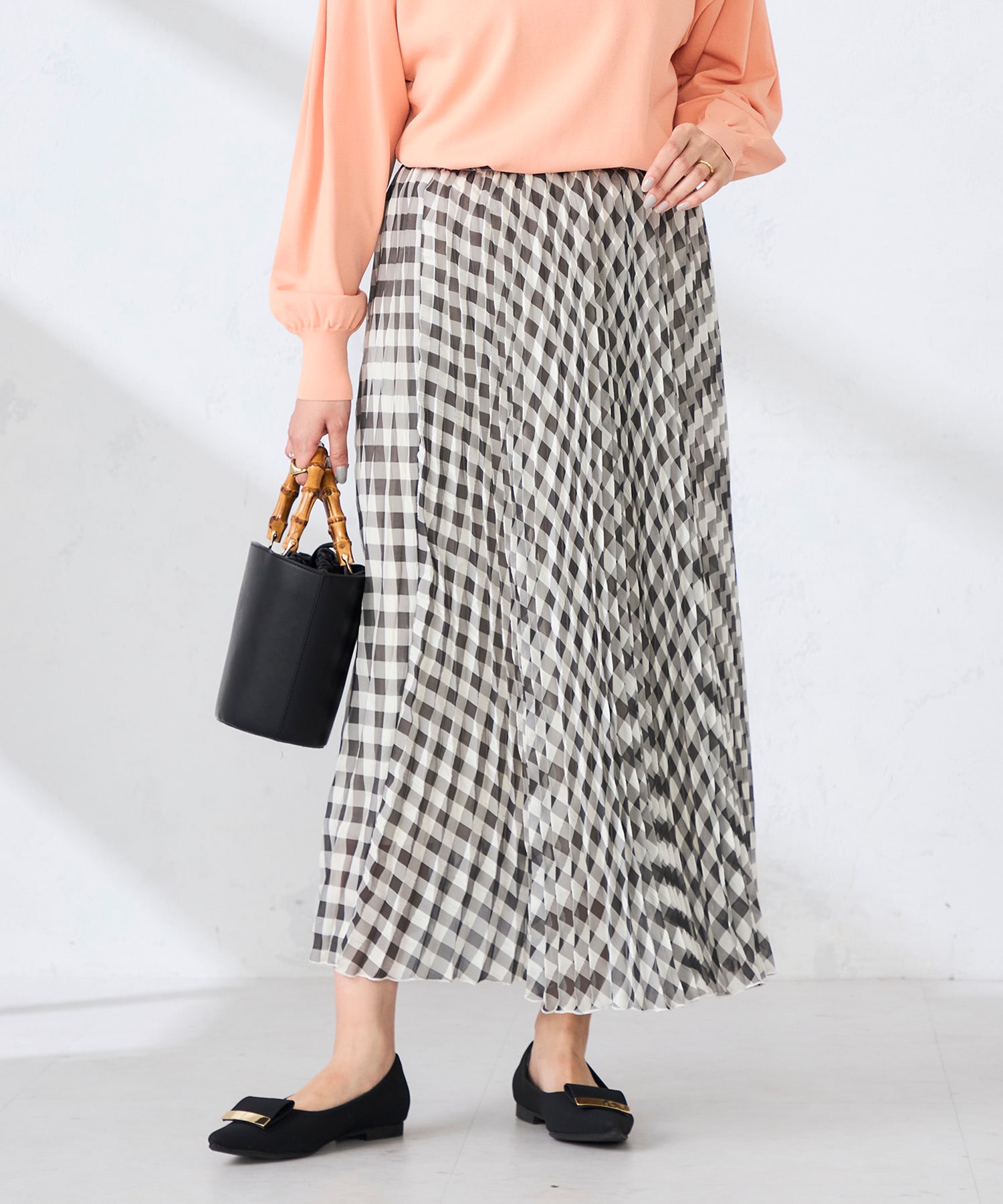 立体的なプリーツが魅力のギンガムチェックスカートは穿くだけで着映えるのでオススメです。