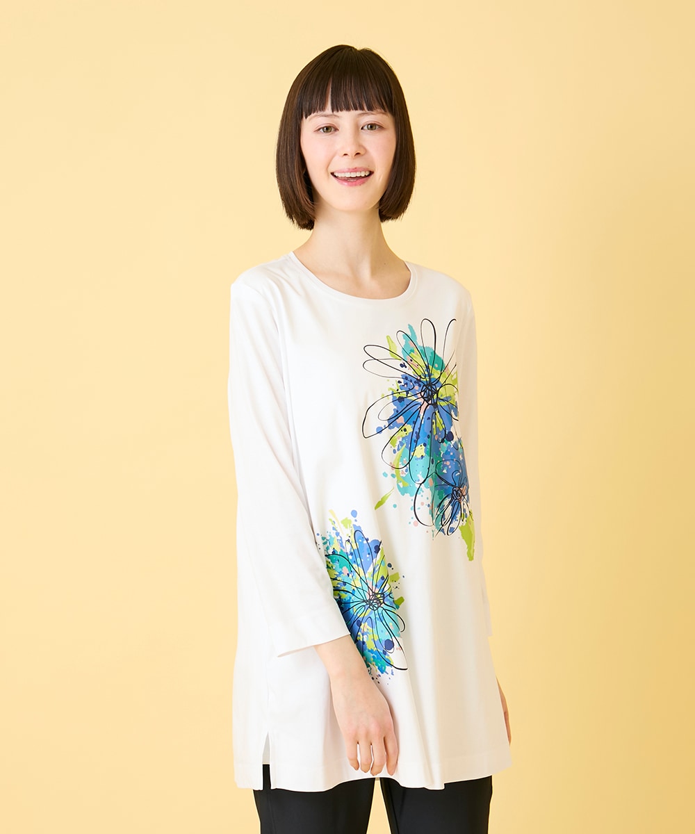 チュニックは着やすいコットン素材でアーティスティックな手書き風フラワーモチーフのカラフルなラバープリントが華やかさを演出し、着映え抜群なアイテムです。七分袖で長い期間楽しめて、体型カバーしてくれる一枚です。