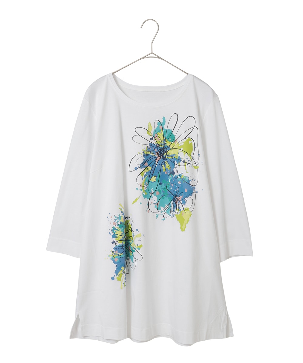 【大きいサイズ】ドローイングフラワーチュニックカットソー /洗える