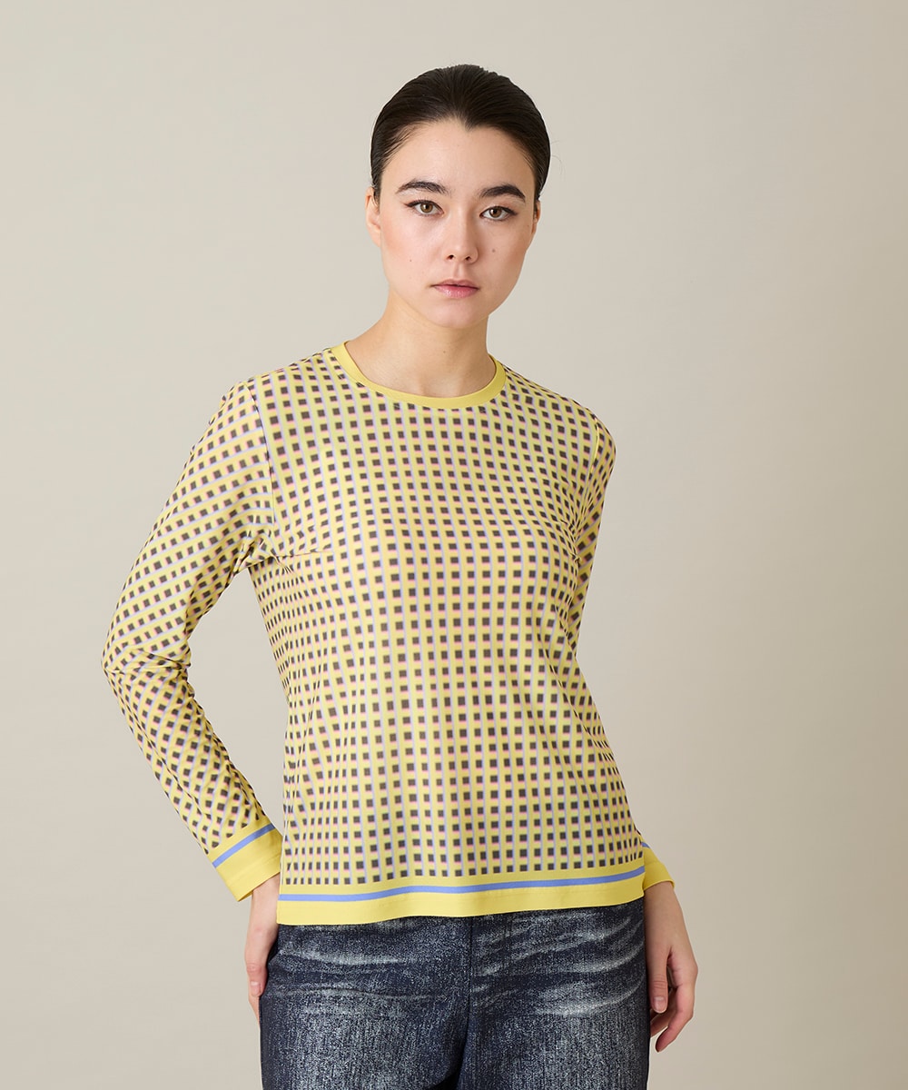 インナーにはイエローとピンクのプリントで春を意識したレイヤードコーデにしました.