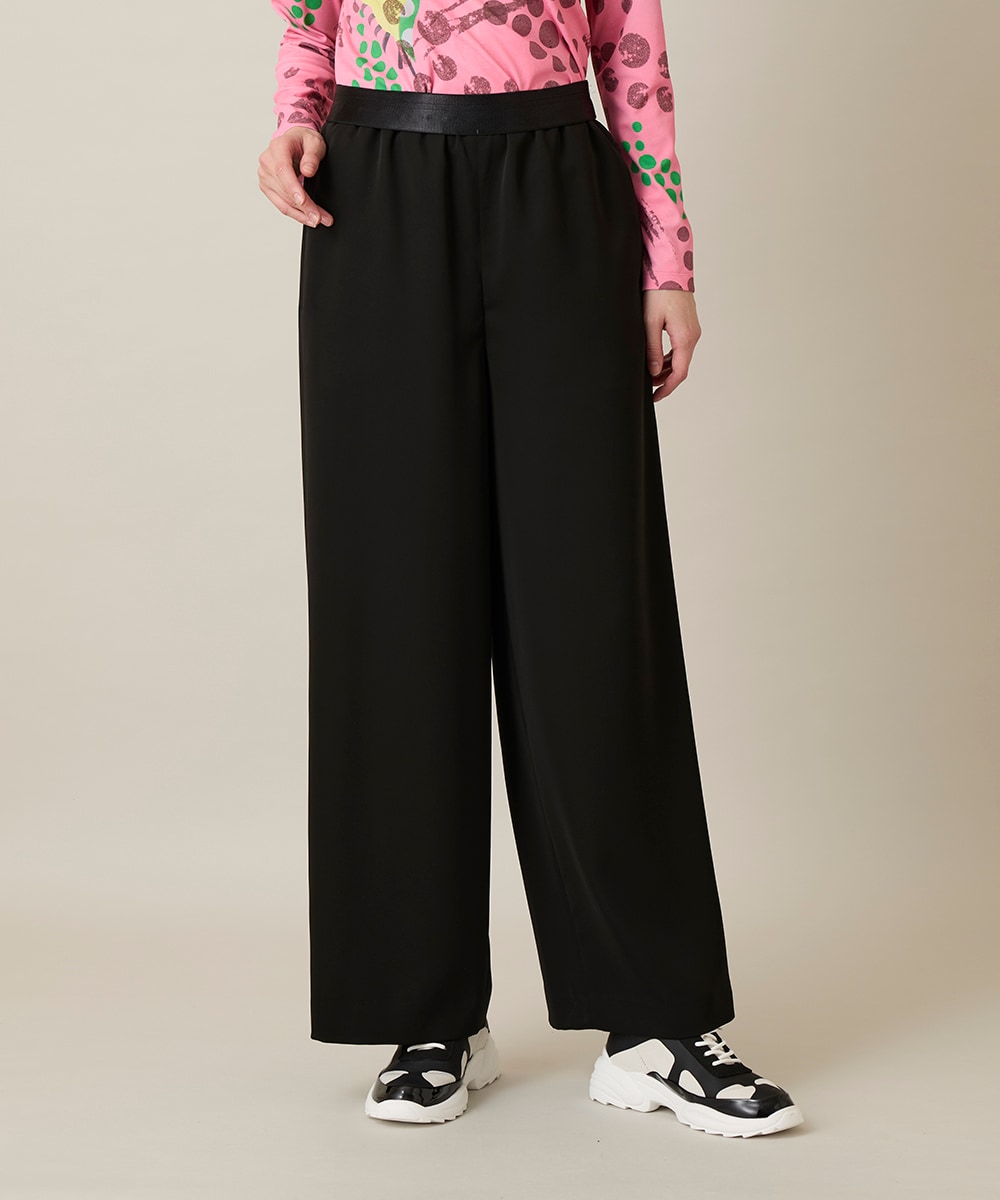 シャイニーウエストストレッチワイドパンツは、落ち感の良い素材ときれいなストレートシルエットが、体型をさりげなくカバーしつつ洗練された印象をもたらします。