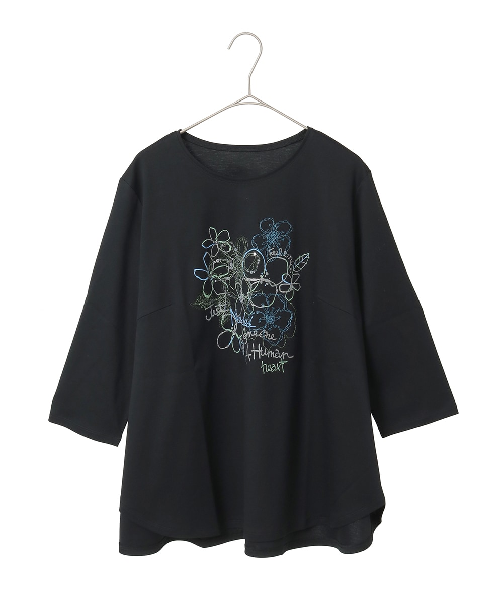 フローラルタイポTシャツ。スパンコールやグリッター、刺繍ディテールを組み合わせた煌きあるフラワーモチーフが印象的な一枚。コンパクトな七分袖と丸みのあるヘムラインも特徴的です。肌触りもよく着心地◎