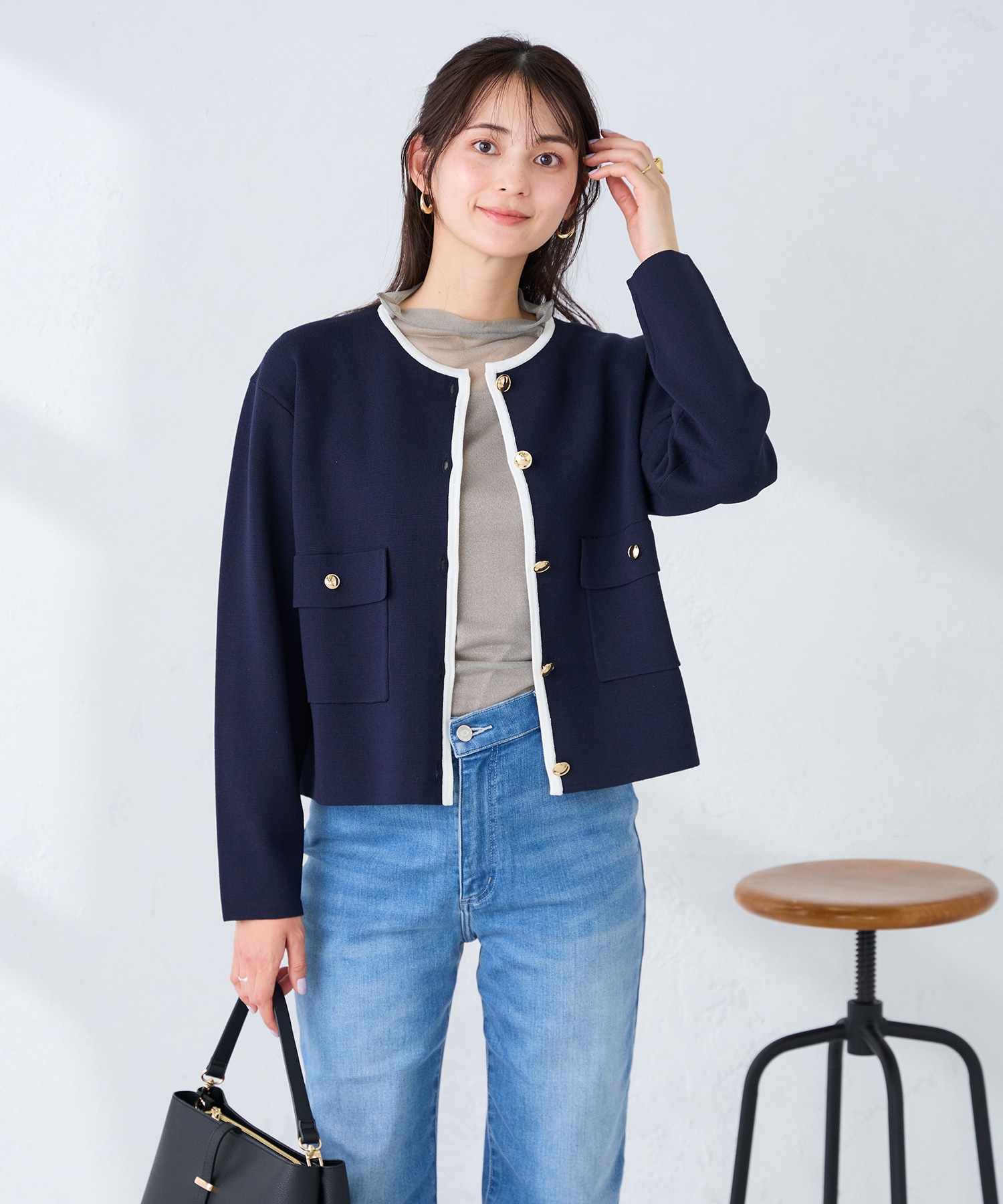 ノーカラーニットカーディガンは、シンプルな形ながら、パイピング仕様やメタルボタンが特徴的な1枚♪