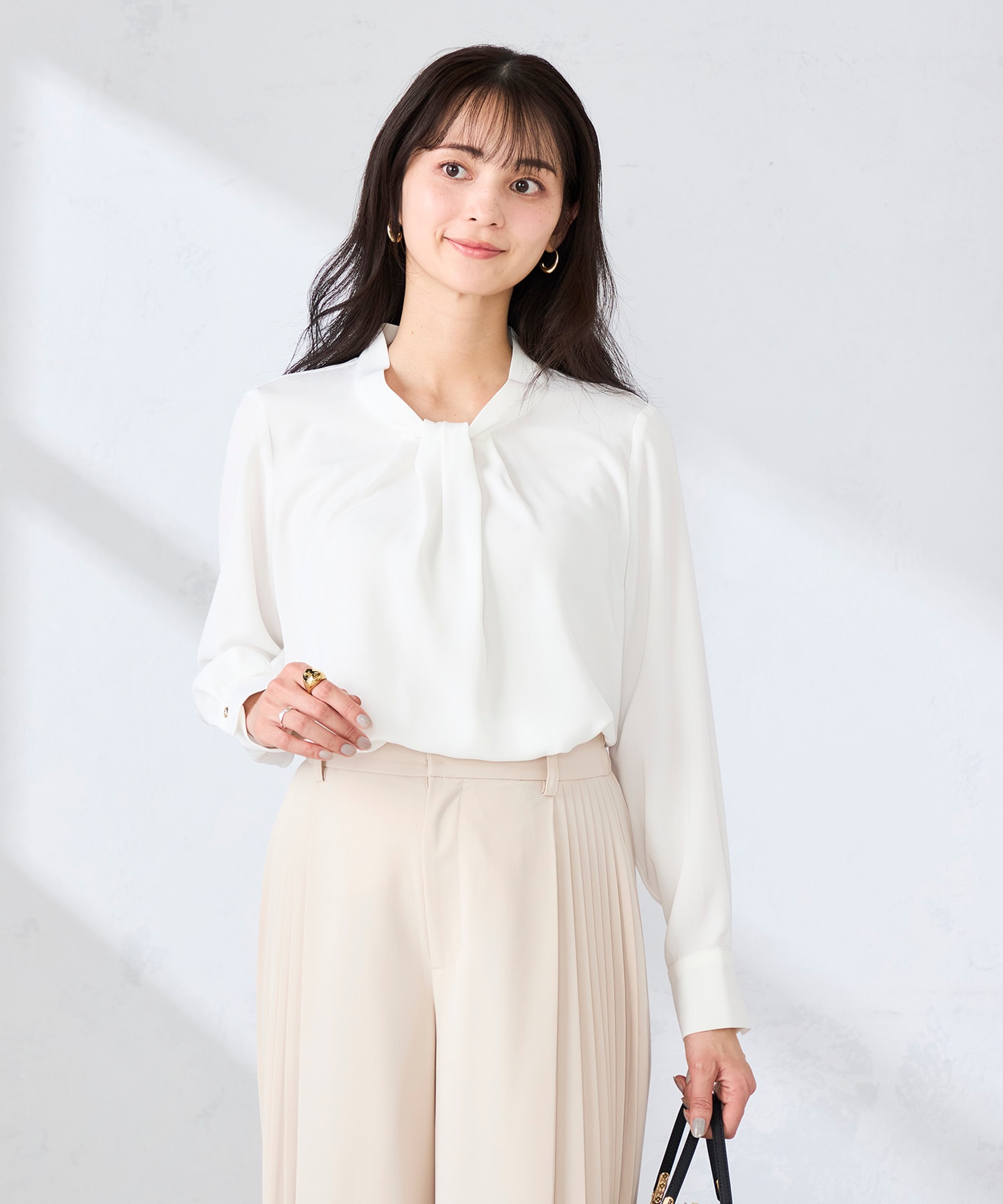 フロントのボウタイ風デザインが上品な、着映え&着回し抜群キレイめブラウスです!