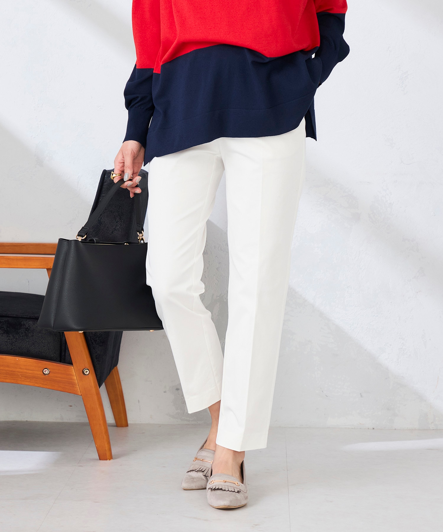 スカートからデニム、カラーパンツまで幅広いボトムと着合わせを楽しめます
