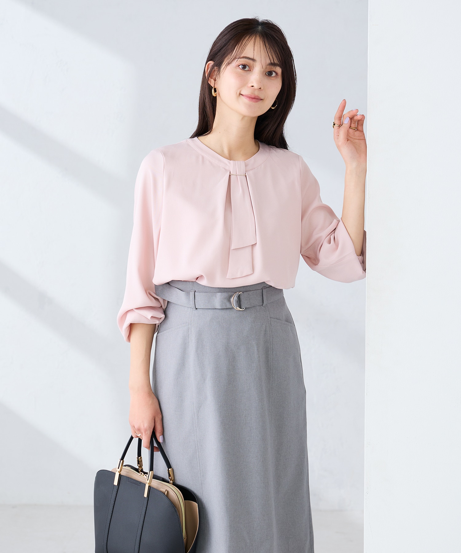 ボウタイは後ろにしまえるので、なしの日はシンプルなブラウスになり、着回し力抜群でいろいろな雰囲気で着用できます。