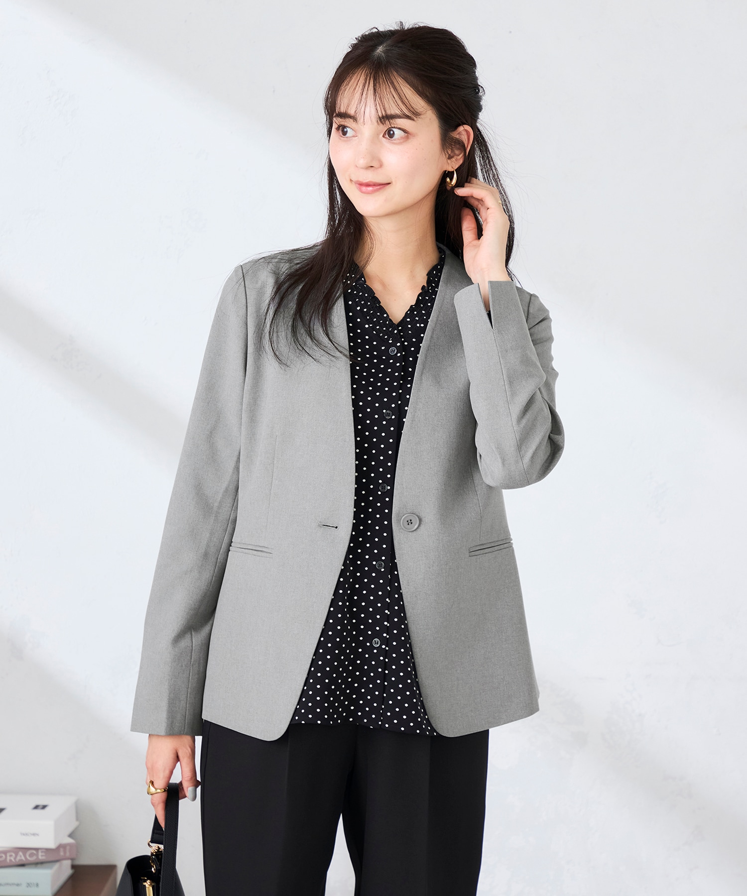 ノーカラーVネックで、きちんと感があり顔まわりをシャープな印象にしてくれます。