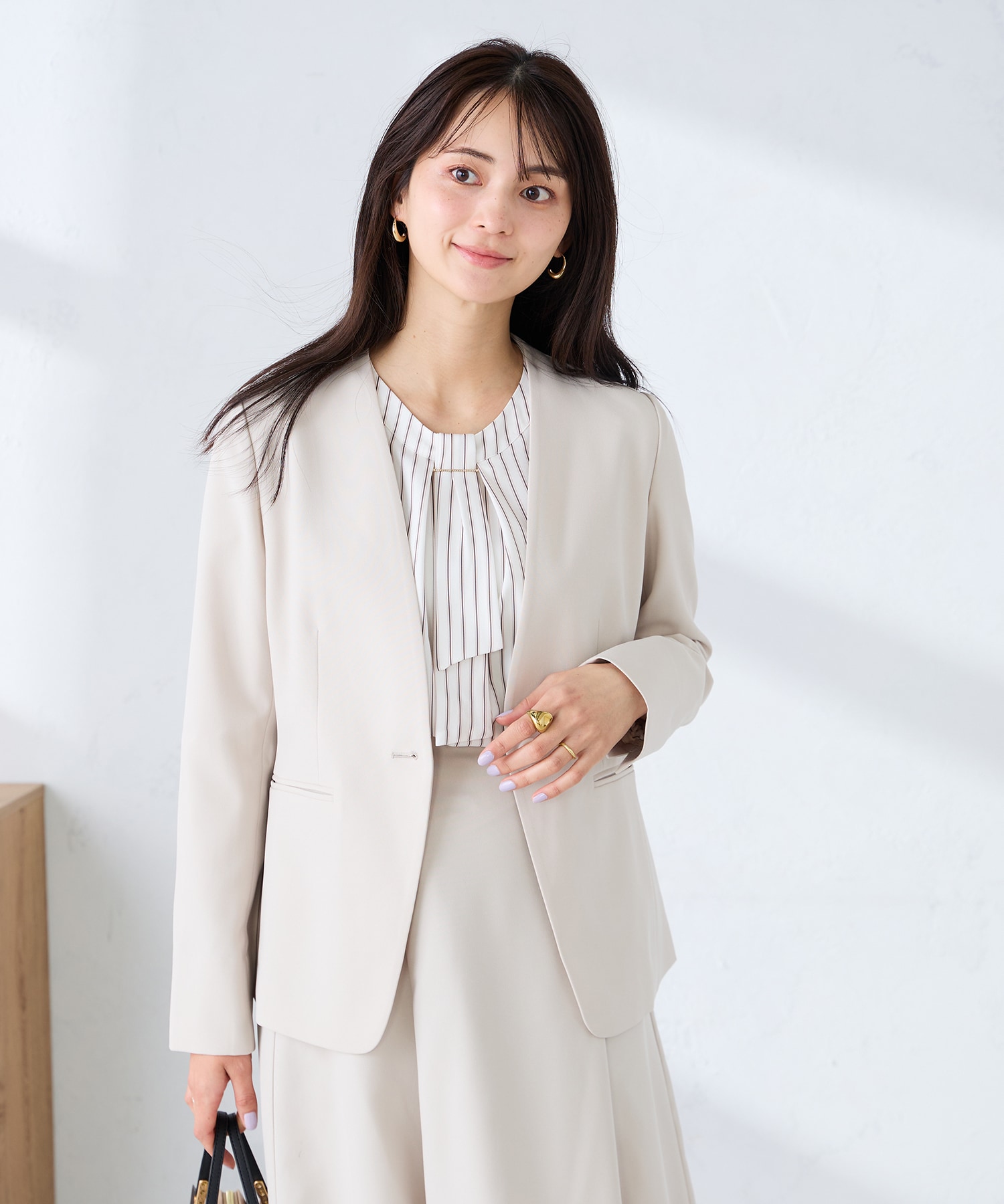 ノーカラーVネックで、きちんと感があり顔まわりをシャープな印象にしてくれます。