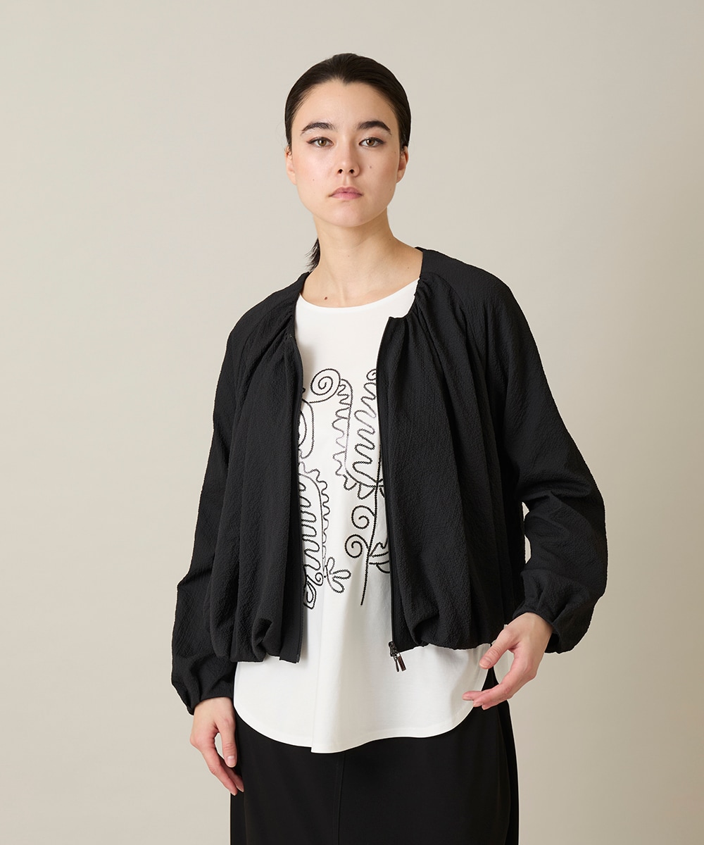 タックギャザーノーカラーブルゾンは、構築的なシルエットにタックとギャザーを施し、
