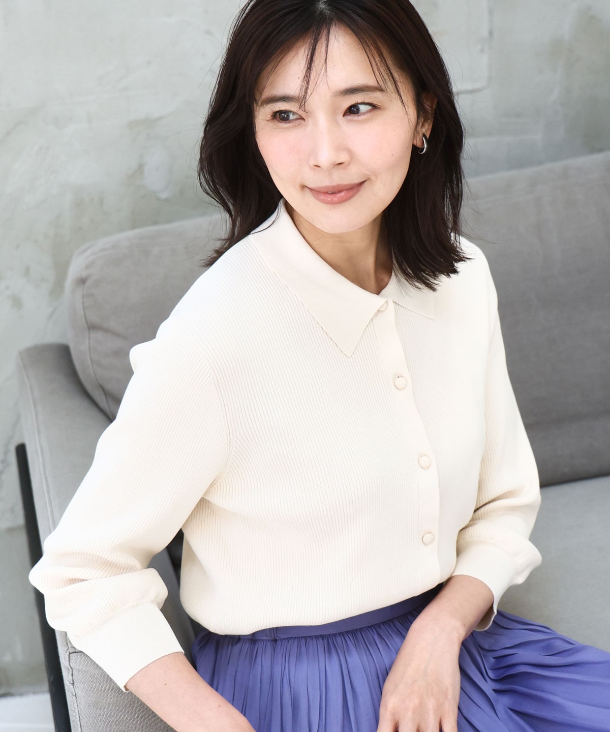 コンパクトな衿付きニット。一枚着として前を閉じてプルオーバーにしたりカーディガンがわりにしたりと多様に着用できます。