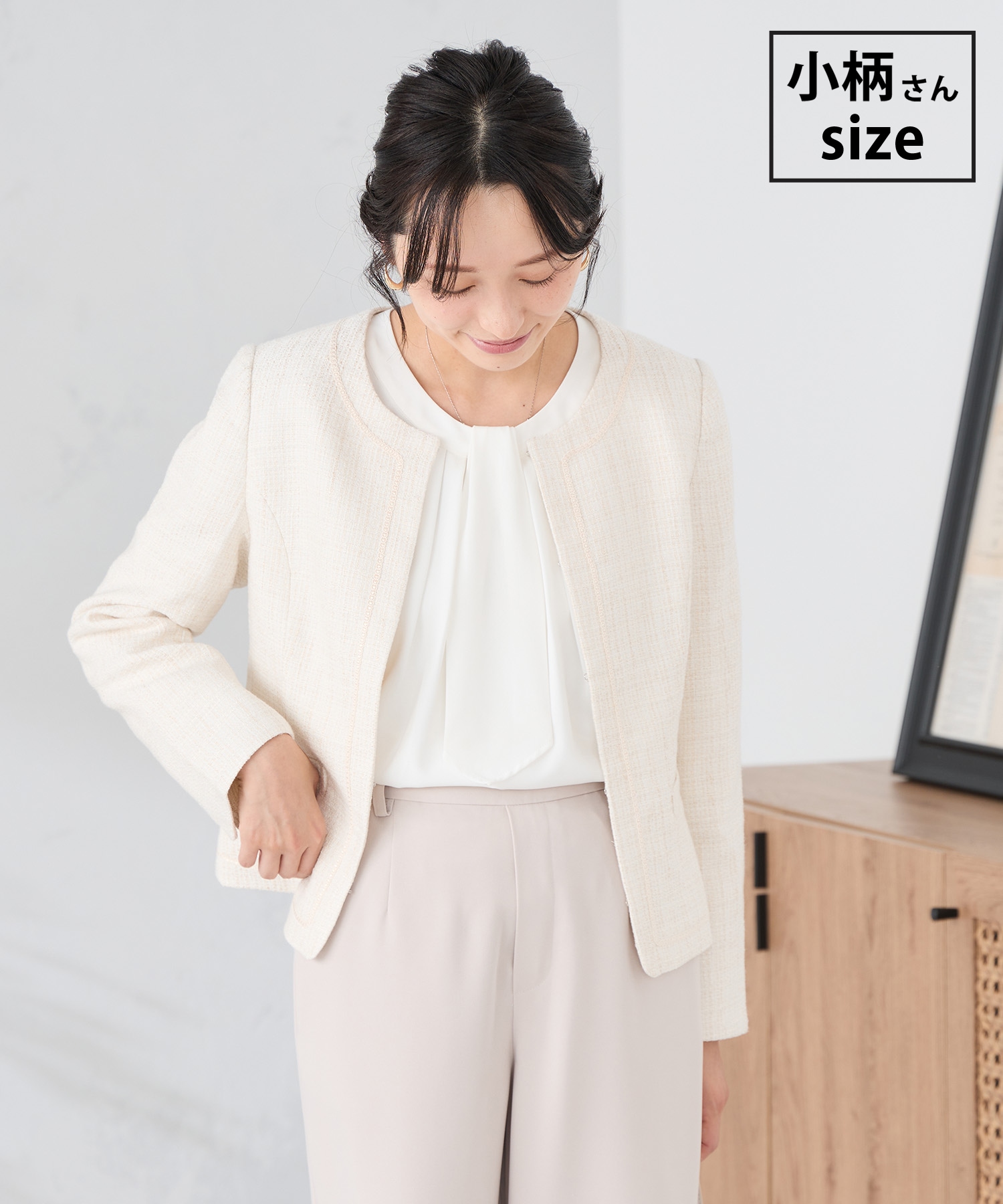 ・ジャケットは肩幅に合ったサイズを探すのが難しいことも多いですが、小柄さんの肩幅・袖丈・コンパクトな着丈が揃ったジャケットです。ストレッチが入っているので、着心地も◎。
