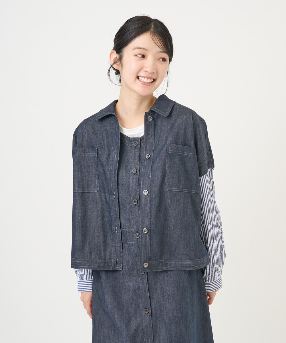 シャンブレー素材のデニムジャケットは、軽やかさと着心地の良さを追求し、袖と背中にはワッシャーシャツ地を組み合わせた異素材コンビネーションで、動きやすさと上品さを両立。