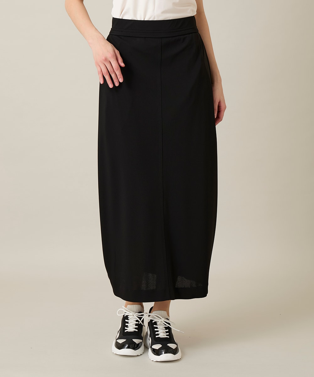 落ち感の美しいスカートは縦ラインがシャープなシルエットを演出し、伸縮性とサイドのタックディテールで体型カバーも叶えます。ウエストゴム仕様で着心地も快適、160cm台後半の方にも似合う丈感で、ランチ会やちょっとした外出に最適です。