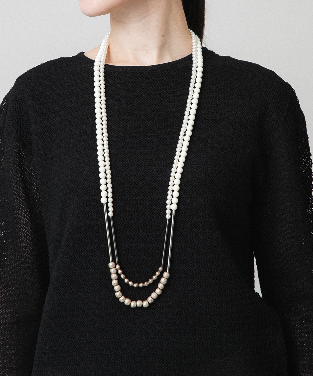 優しいアイボリーやパールパーツを配したネックレスは、コーデに華やかさをプラス。