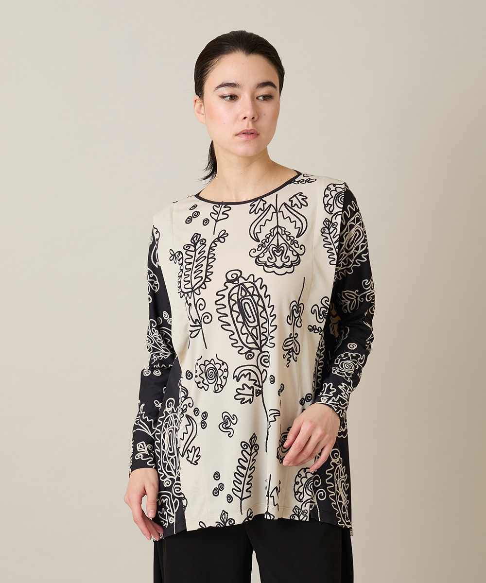 ボタニカルプリントチュニック丈ブラウスはモノトーンのボタニカル柄がシックで着映えのするデザインです。