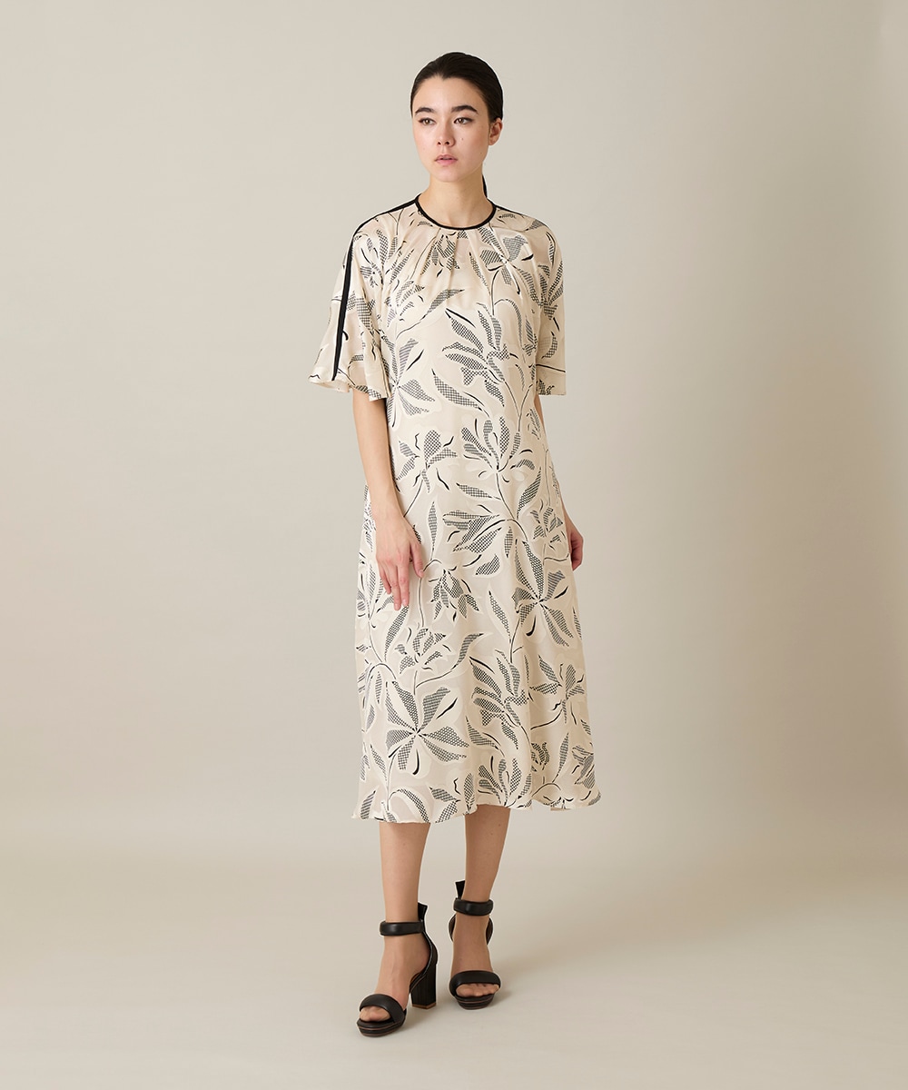 イタリア製素材使用のオパール加工のフラワー柄ワンピースです.軽くて上品なウェストをドローストリングでフォルム調整の可能なエレガントなワンピースです。