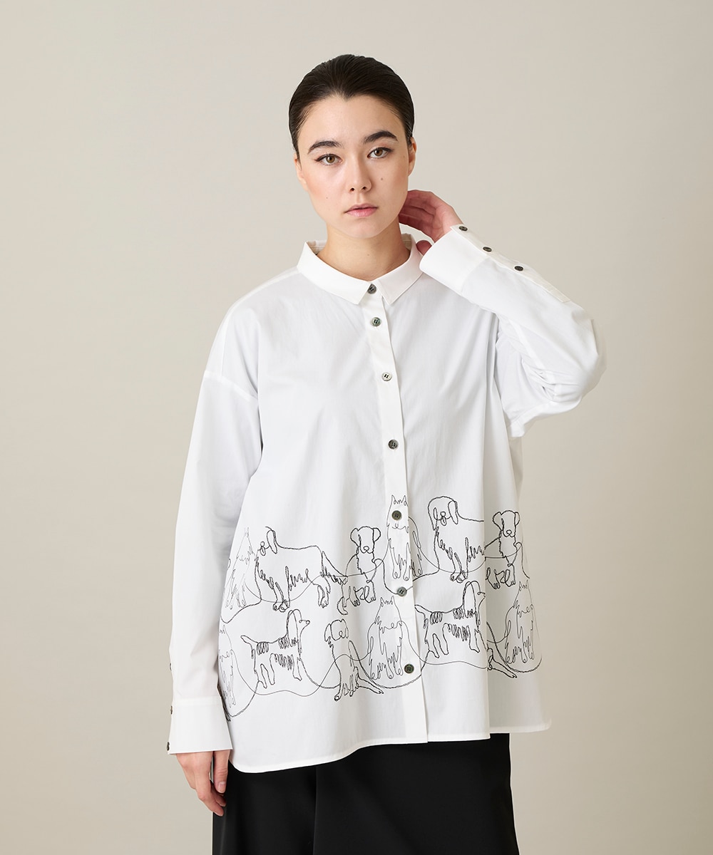 白いストレッチブロードに刺繍タッチで表現した線タッチドッグ柄のブラウスです。白黒の配色が清涼感ある春のブラウスです。