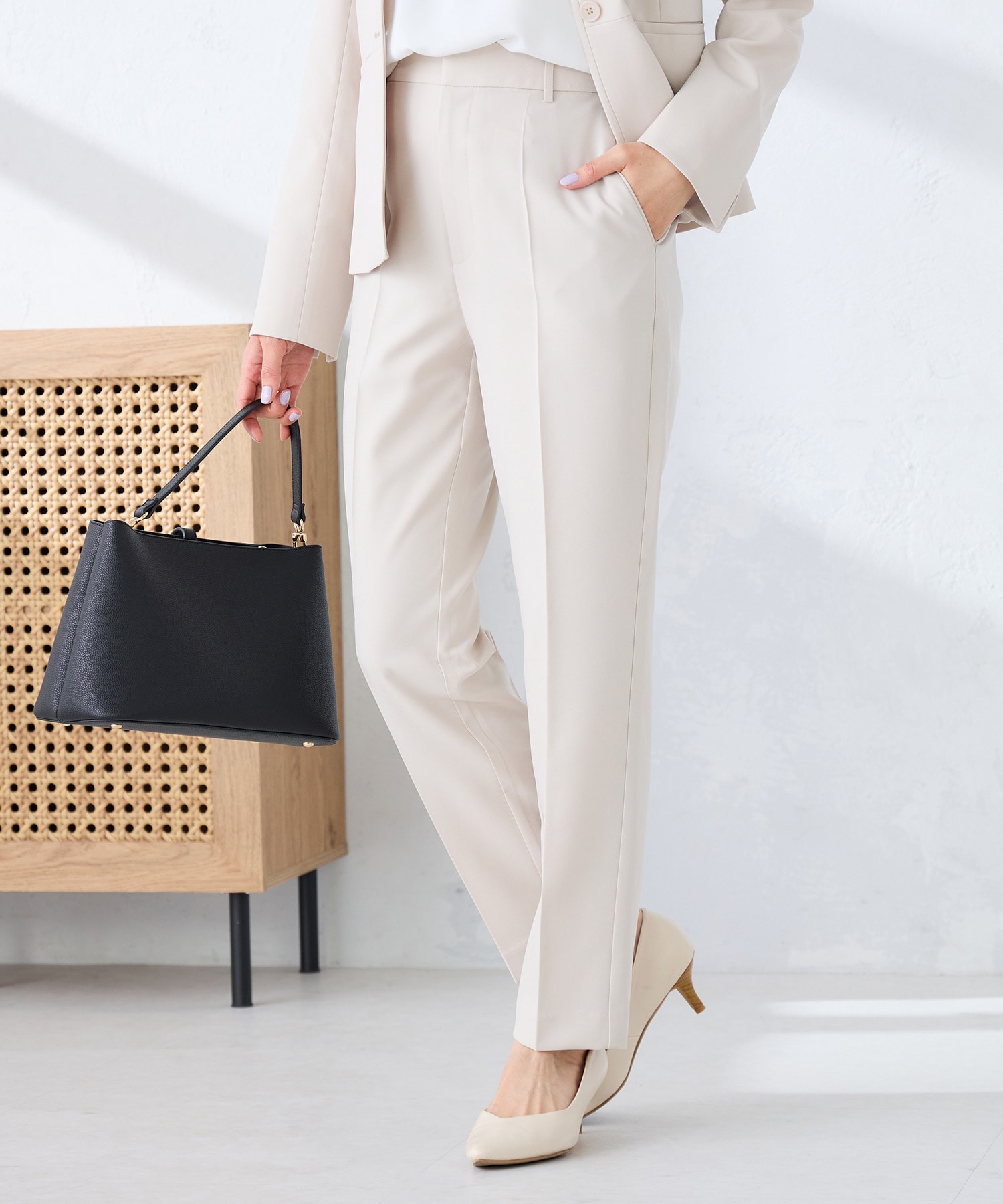 麻調素材のジレとテーパードパンツは