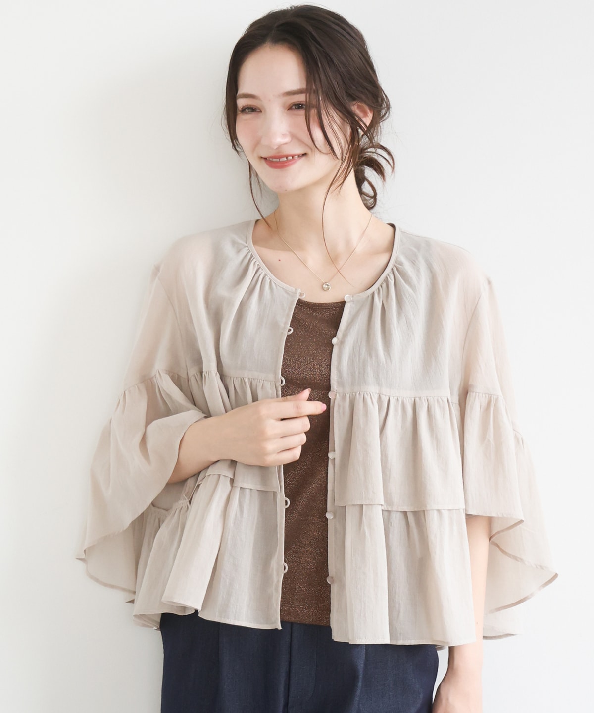 シフォンのティアードブラウスは、軽やかなシアー素材とふんわりしたシルエットで、コーデの主役に。丈が短めなのでバランス良く着こなせ、大人の女性らしさを引き出します。