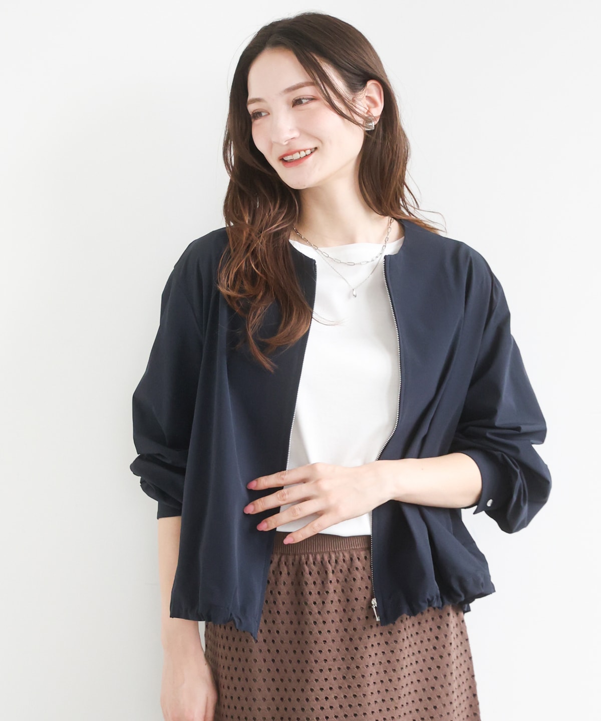 ストレッチライトブルゾンは、すっきりとしたデザインと軽やかな着心地が魅力。季節の変わり目のコーデに最適です。裾のドローコードで調整可能なため、フィット感を変えられます。