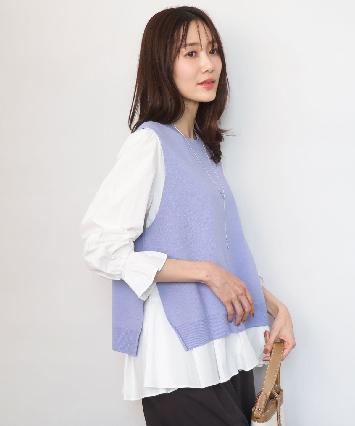 ニットとブラウスセットで着こなすと、今年トレンドのコーディネートに。インナーを変えたり、ブラウス1枚で着用したり、着回しを楽しめます。
