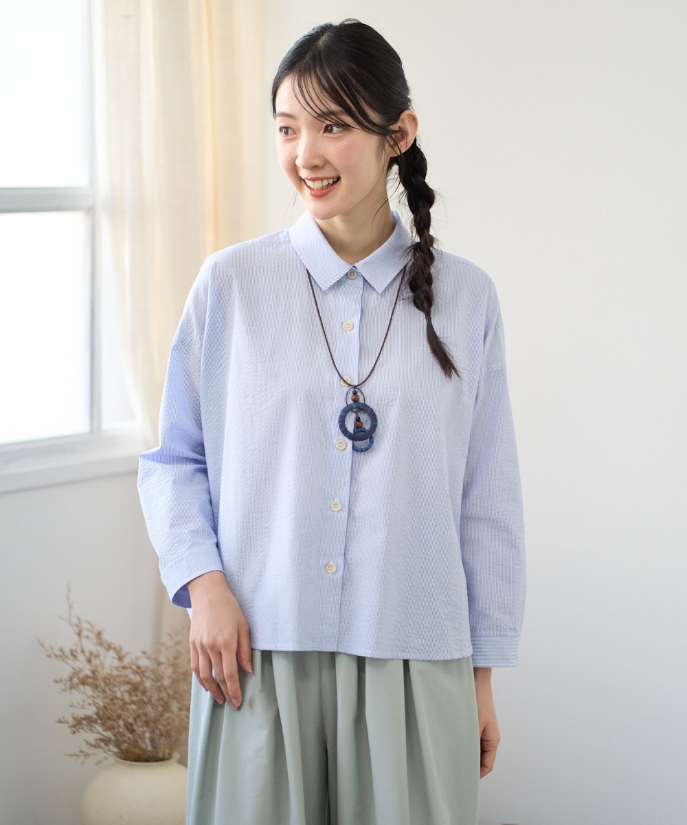 軽やかなストライプ柄のコットンシャーリングブラウスは、横長シルエットと小さなシャツカラーが洗練された印象を与えます。