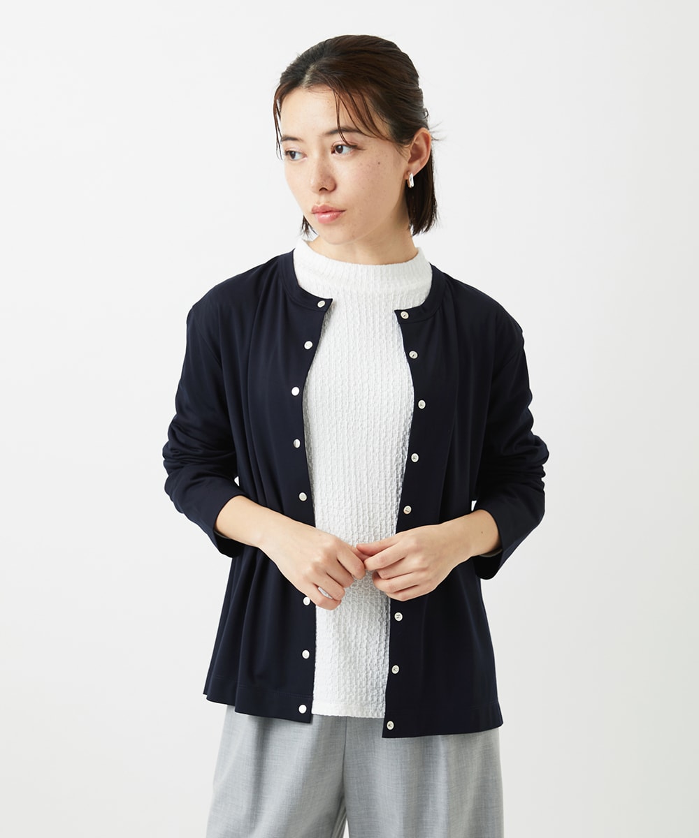 柔らかなカットソーのスナップカーディガンは、夏に向けて一枚あると便利です。