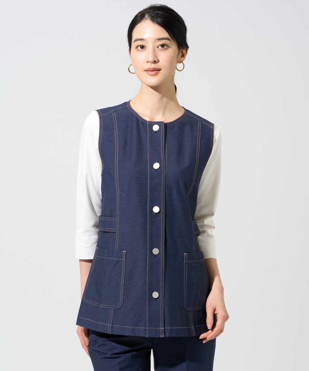 ノーカラーの襟元が美しい前開きタイプのジレは、体のラインを綺麗にカバーします♪