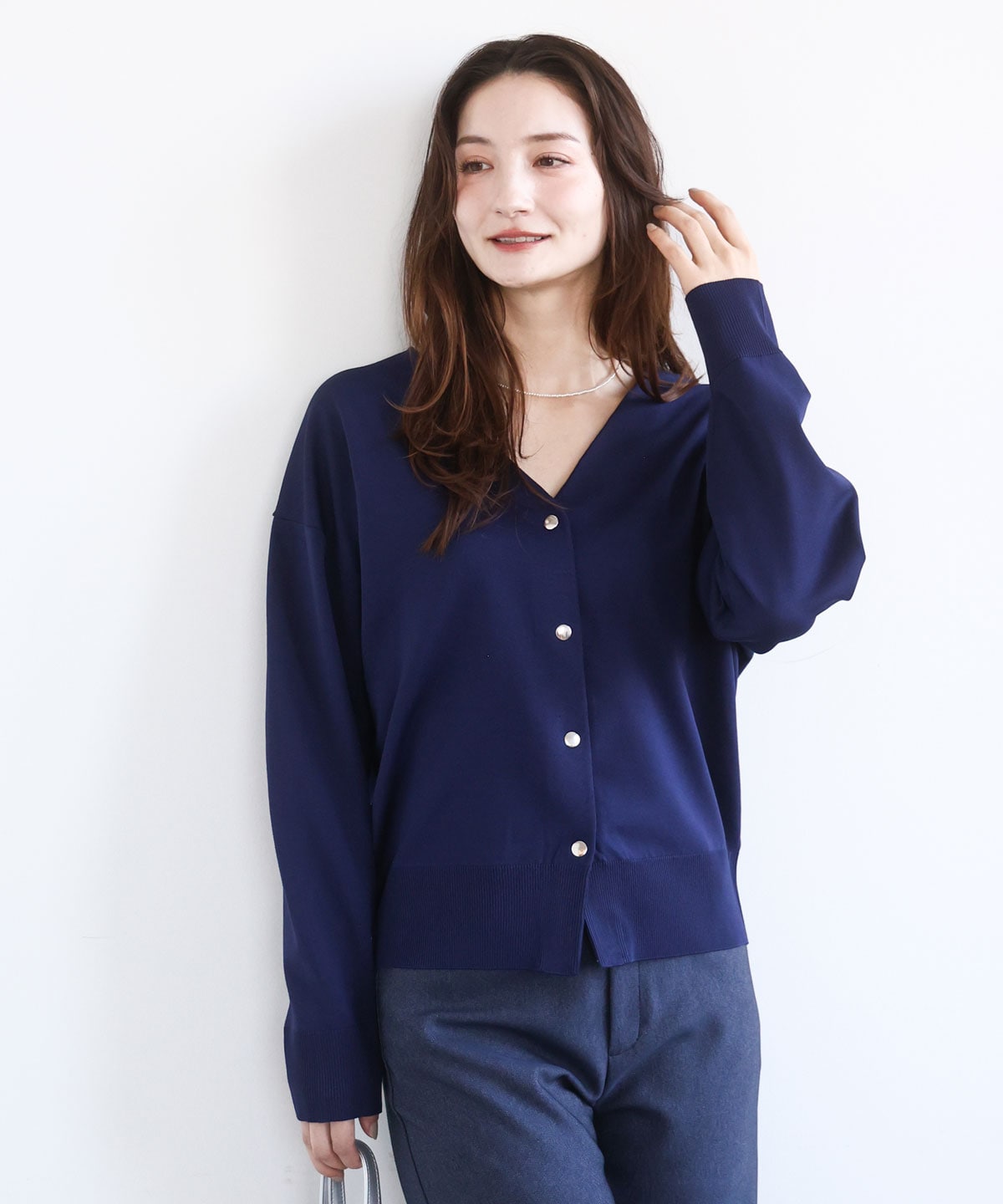 [洗える]ドット釦Vネックカーディガン(無地・ボーダー)