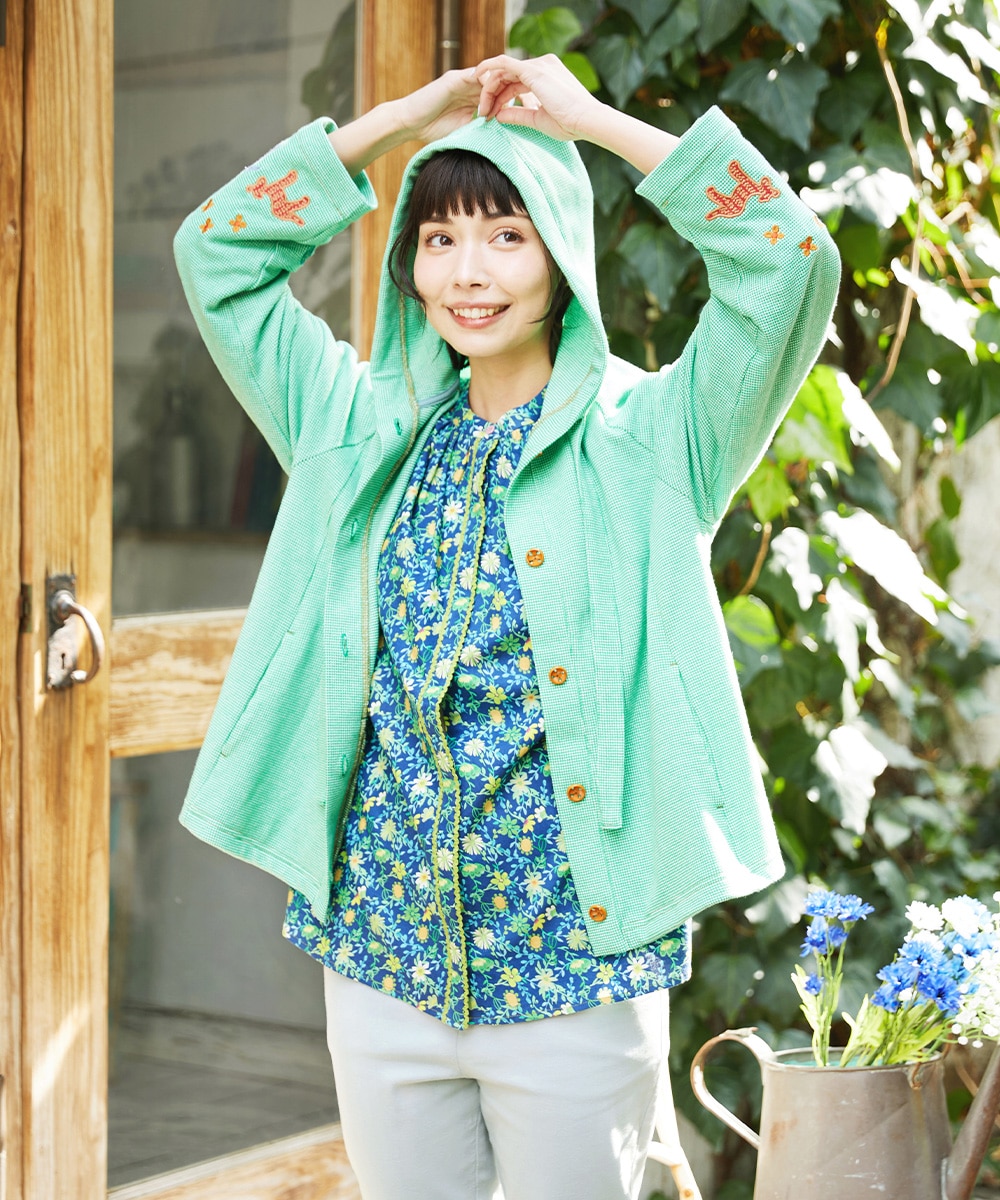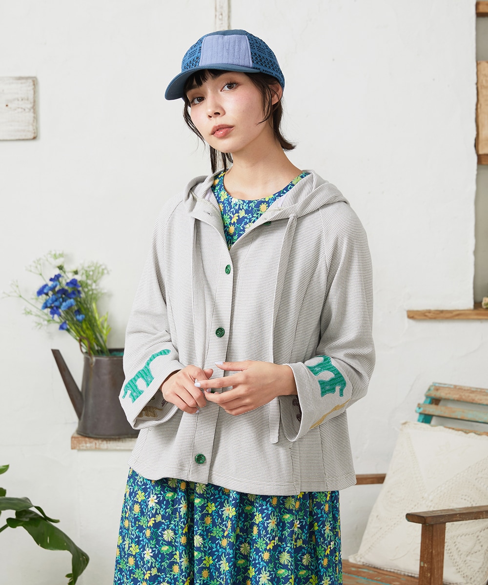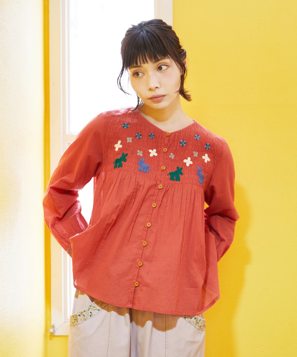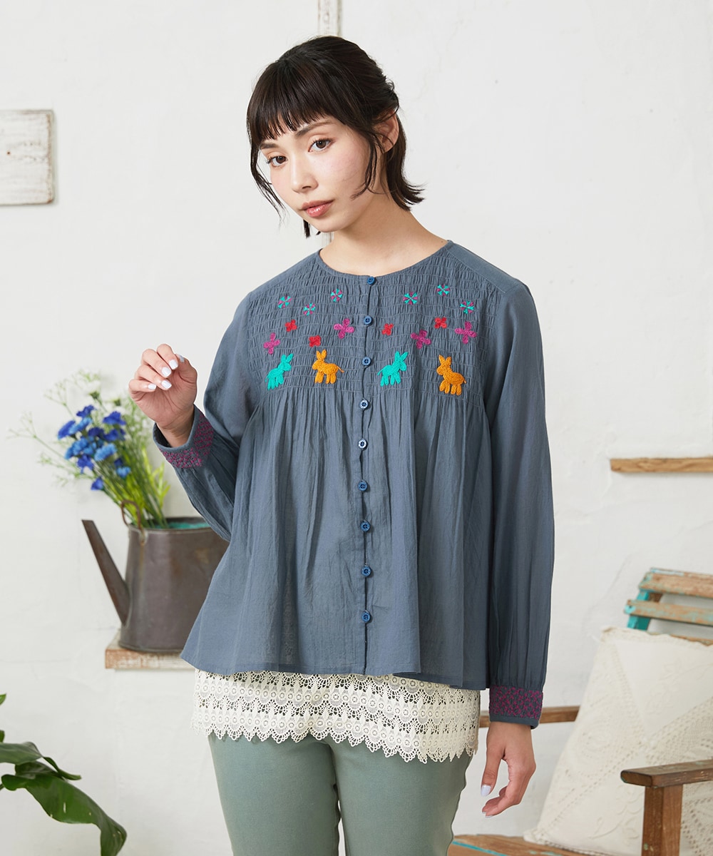 シャーリングの上に並ぶ動物やお花の刺繍が愛らしく、着るだけで気分が上がる一枚です。