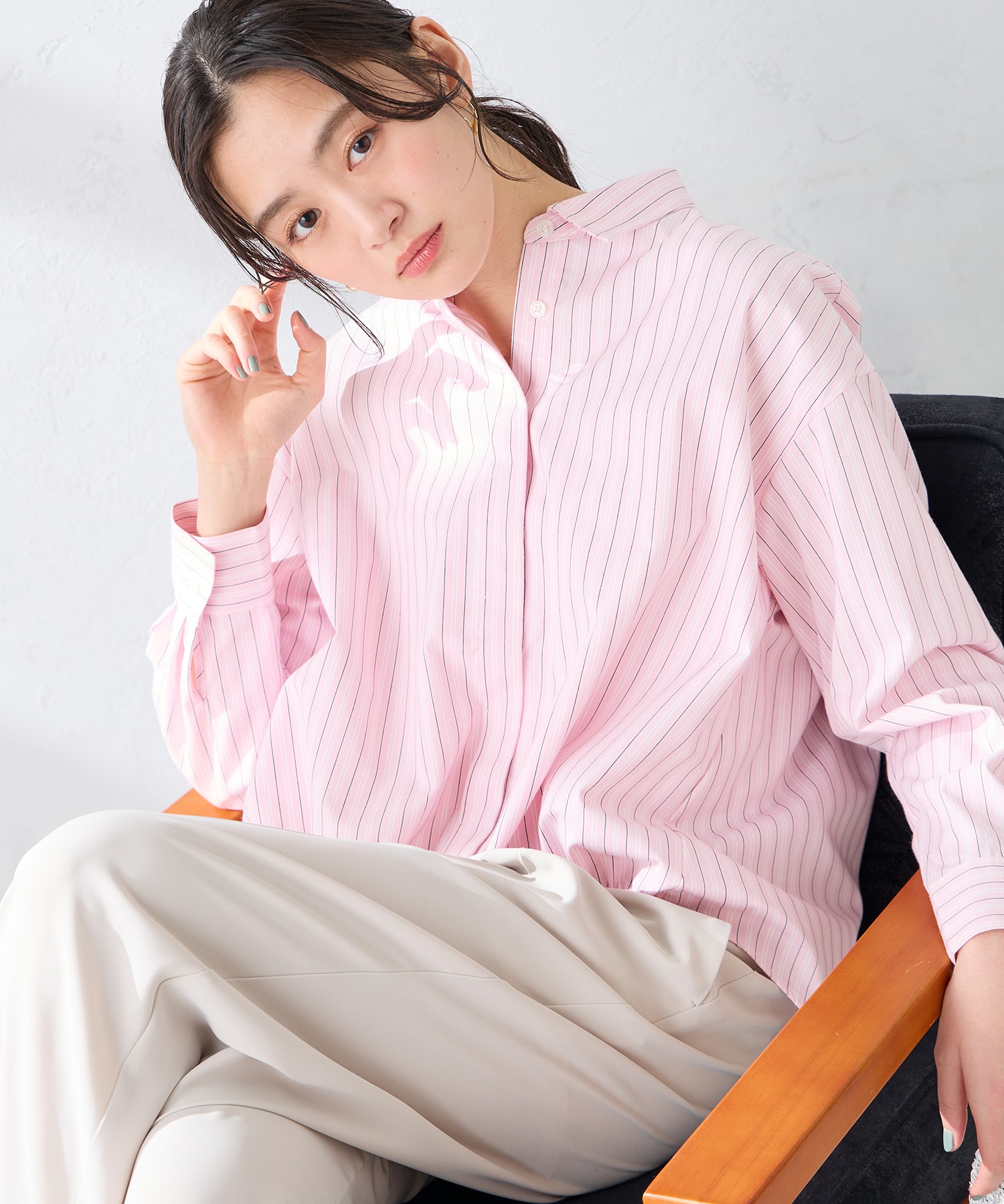 シャツは、前裾がドロスト仕様になっており、後ろは長め丈で、スッキリ見せつつ、気になる腰回りもカバーしてくれるデザイン。ボタンを閉めてトップスとしても、羽織としても使える1枚です。