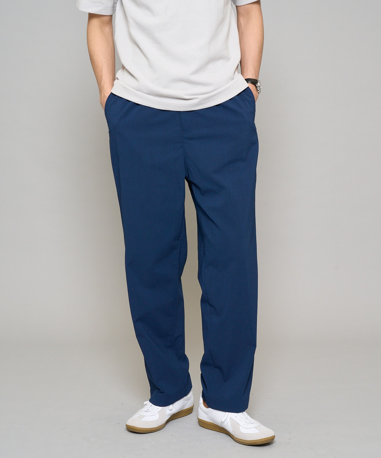 セットアップのパンツはセミルーズシルエットでウエスト紐付き、楽に着こなせるのも魅力。