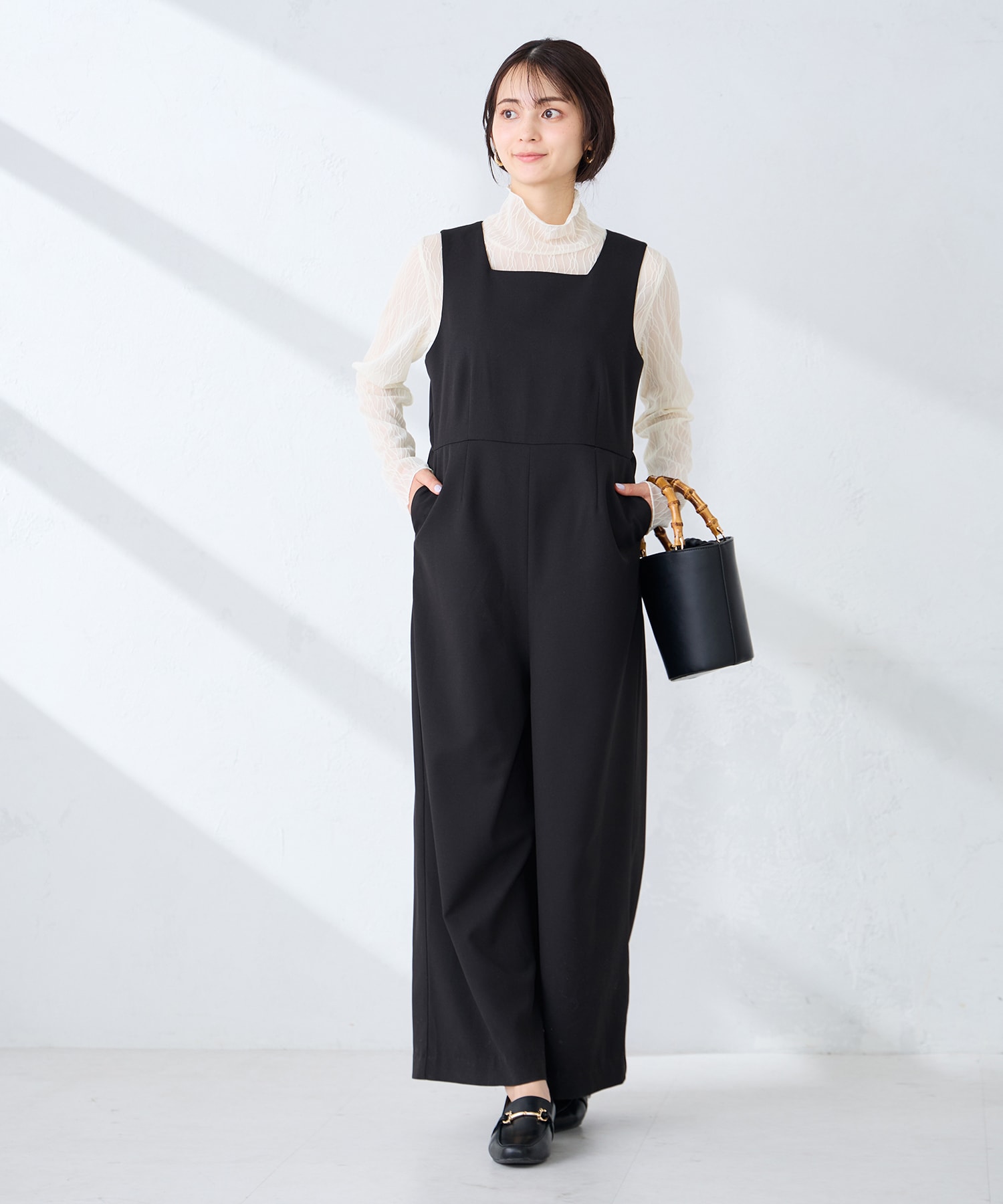 インナー次第でオンオフ使えるのが嬉しい、ゆるっと着られるオールインワンです!