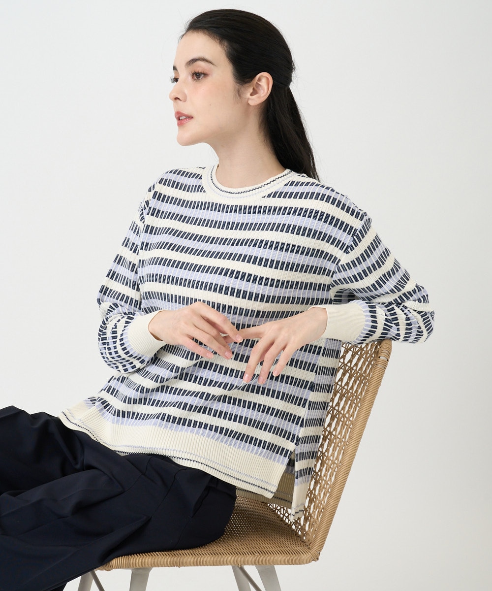 上品さと楽ちんさを兼ね備えた「ボーダニット」は、シングルジャカードの繊細なボーダー柄と配色が、カジュアル過ぎず洗練された印象に。