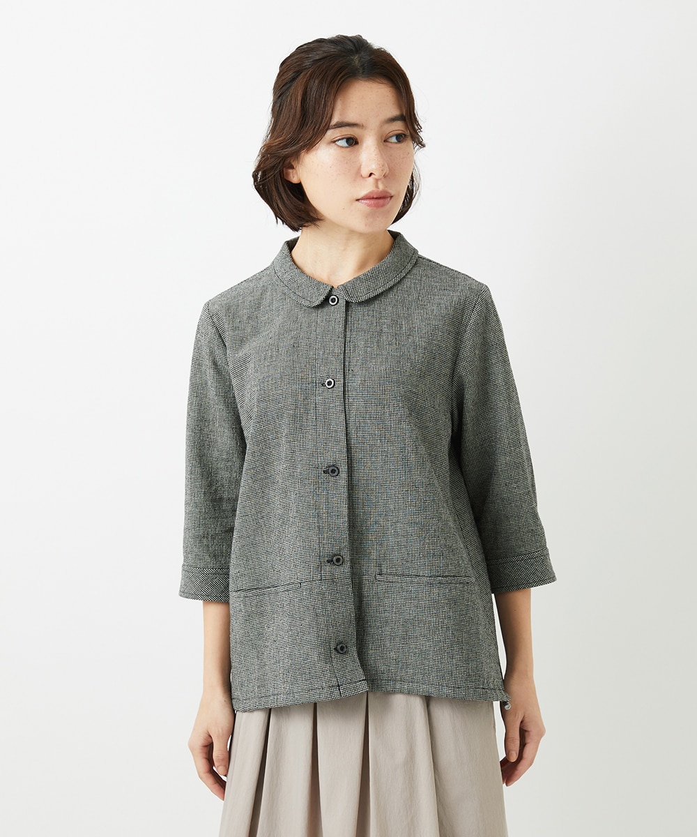 どこかレトロな麻コットンのシャツは、小さなお襟もかわいい。