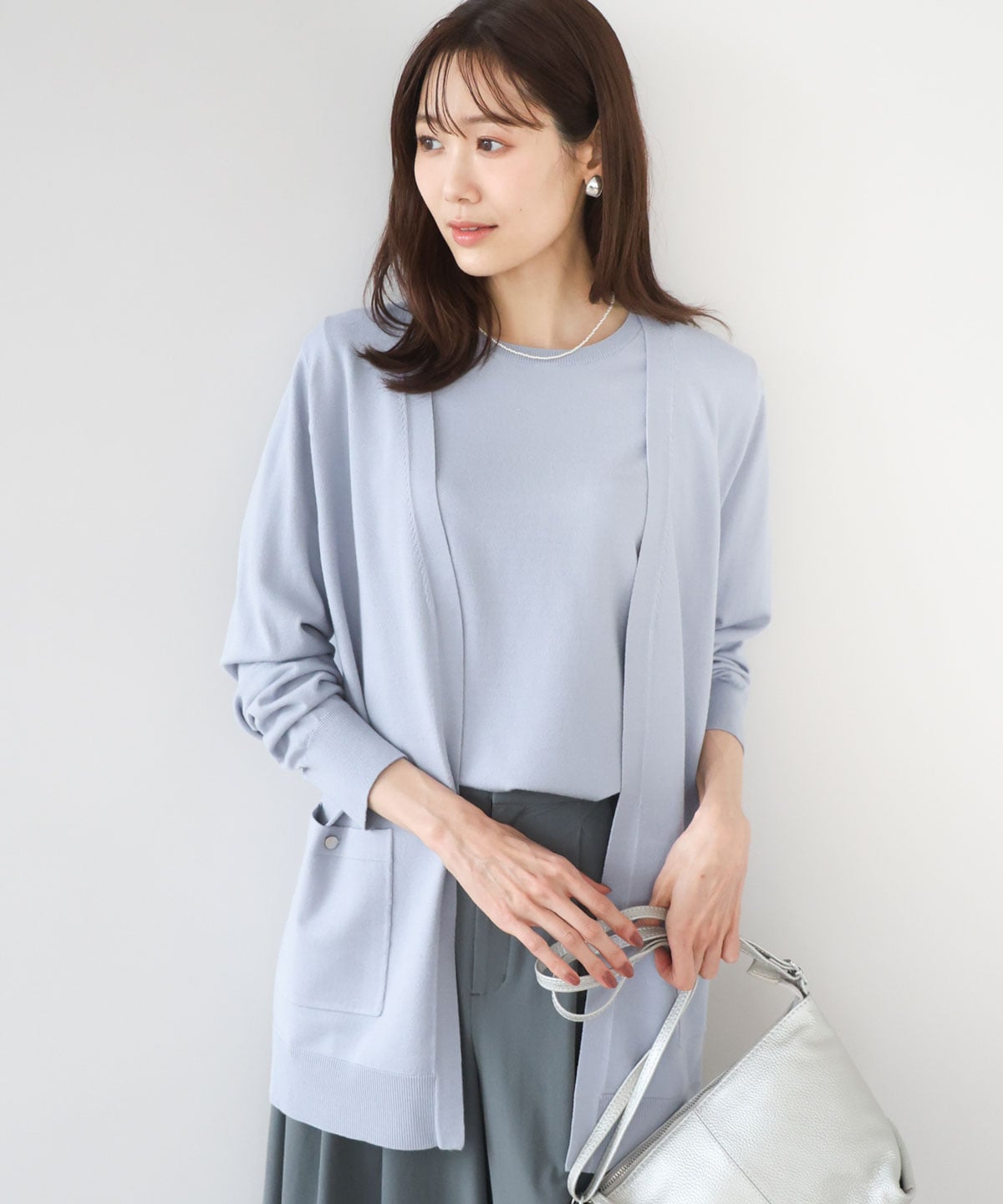 カーディガンのポケットにはメタル釦をあしらい、よりジャケットライクなデザインに