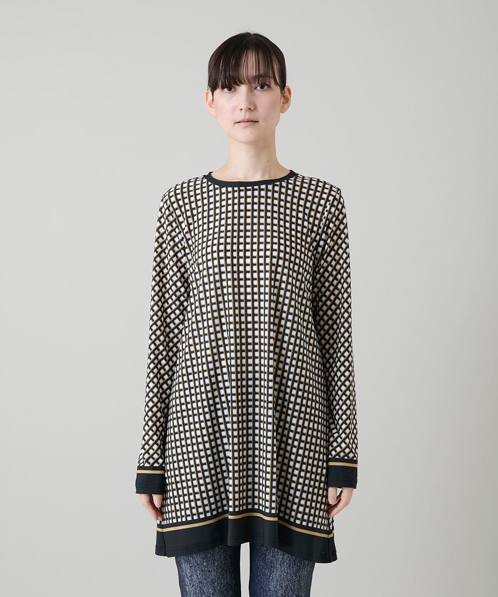 取り扱い店舗限定のチュニックは立体的に見えるチェックが身体のラインをカバーする一枚です。気になる腰回りをカバーしながら、長すぎない着丈のため小柄な方も重い印象になりません。細かい凹凸感があるので肌離れが良く涼しい着用感です。袖口や裾の無地配色がメリハリをプラスします。細いパンツはカジュアル、太いパンツはモードなスタイリングが完成します。
