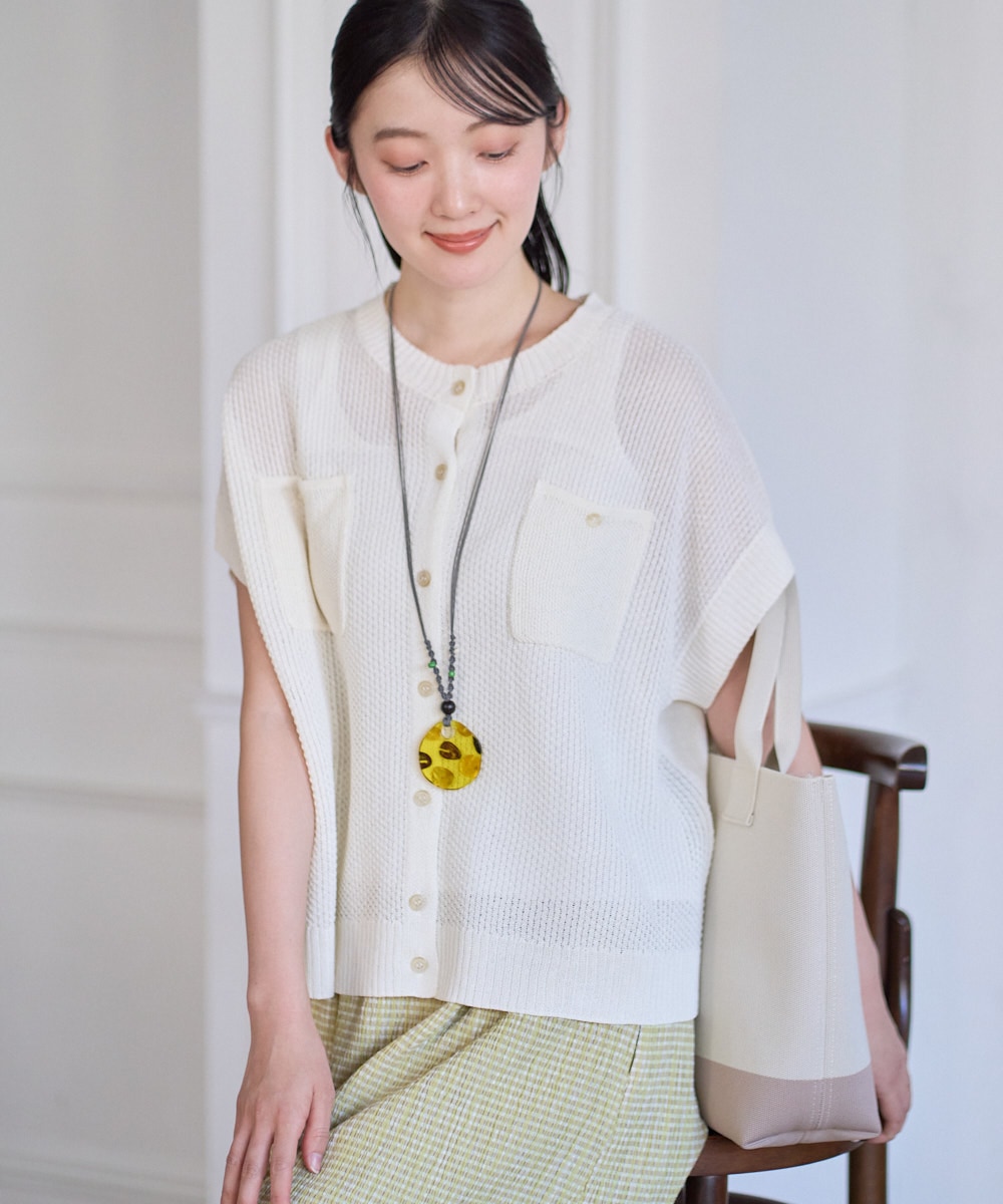 ニットは和紙の入った糸でシャリ感があり、軽く爽やかな着心地。鹿の子編みの編み地や胸ポケットがアクセント。夏はボタンをとめてシンプルにサマ-セータ-としての着用もおすすめです。