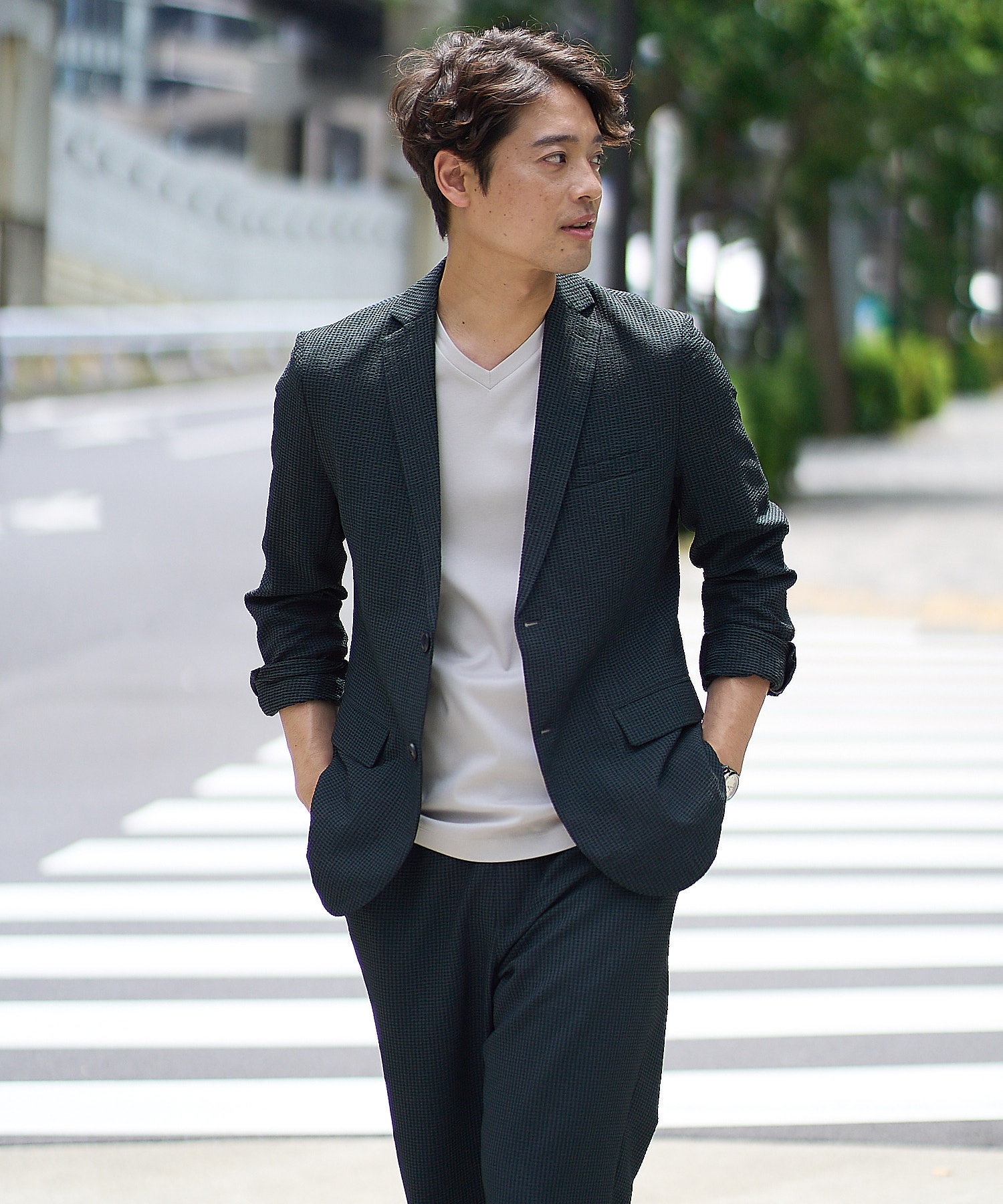 夏の装いにぴったりの、サッカー素材を用いたキレイ目シルエットのジャケットとスッキリ見えるウエストゴムパンツのセットアップ。